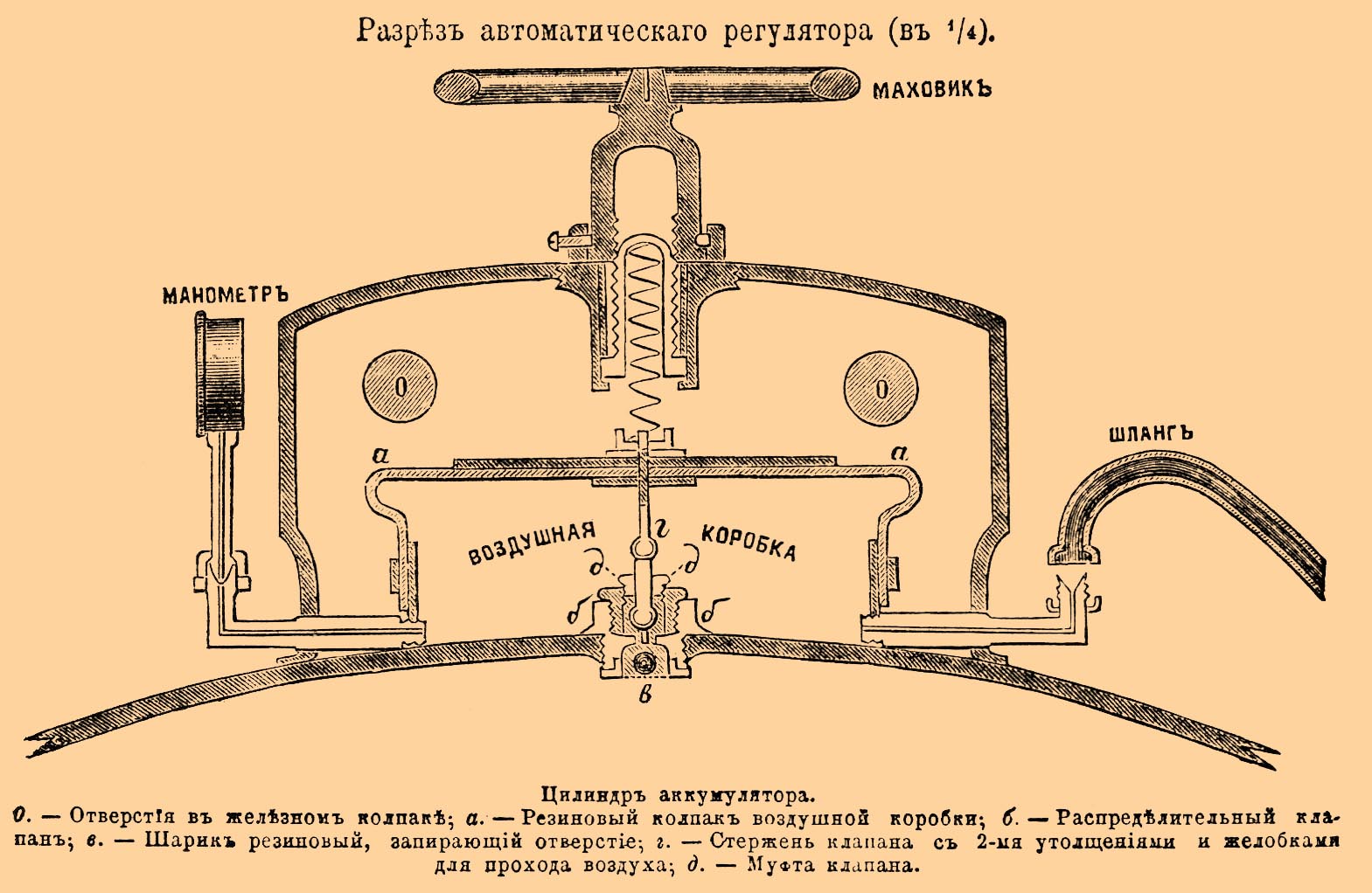 Цилиндр аккумулятора. О. — Отверстия в железном колпаке; а. — Резиновый колпак воздушной коробки, б. — Распределительный клапан, в. — Шарик резиновый, запирающий отверстие, г. — Стержень клапана с 2-мя утолщениями и желобками для прохода воздуха; д. — Муфта клапана.