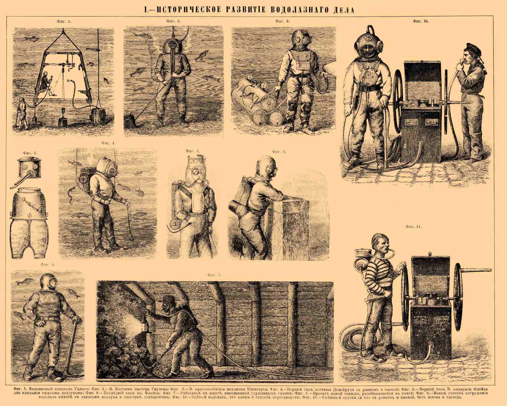 Бывают случаи, когда необходимо войти в места, наполненные атмосферой, не способной поддерживать дыхания, например, при пожарах в дымную атмосферу, в некоторых мастерских, в шахтах, колодцах и других местах. Обыкновенная водолазная одежда и вентиляция могли б с успехом помочь и этому, но она рассчитана на плавучесть, и части ее слишком тяжелы и обременительны, поэтому как Денейруз, так и фирма Бэрнетт и Фостер, Чарльз Абель, Вильям Август Горман и др. предлагали несколько типов таких аппаратов. Большинство из них состоит из: респиратора, носового зажима с очками, переносного резервуара с воздухом (ранец) и минной лампы; затем — шлангов, всегда прочных, и воздушного насоса, который помещается вне, на чистом воздухе; такой аппарат изображен на фигуре 7-ой. Фигура 8-ая должна изображать усовершенствованный способ одевания водолазного костюма, имеющий целью ускорить этот мешкотный процесс, продолжающийся обыкновенно не менее 8-12 минут. Кроме разреза костюма у пояса на две части, изобретатели стремятся парализовать громадное давление воды на глубине, окружая тело металлическими обручами, как бы латами, причем давление внутри шлема и одежды может быть гораздо меньше давления окружающей воды. Однако до сих пор еще нет практично выработанного аппарата для указанных целей. Современные типы водолазных аппаратов изображены на фиг. 9, 10 и 11. На первой из них водолаз в костюме В. школы освещает себе дорогу электрическою лампою, которая получает источник света из ящиков со вторичными элементами, которыми заменили свинцовые грузы на груди и на спине (изобретатель-поручик Золотухин при минном офицерском классе в Кронштадте 1885 г.). Водолаз тащит за собою водолазный аккумулятор, откуда получает для дыхания сжатый воздух, давление которого он может регулировать сам маховичком, изображенным на фиг. 9, наблюдая за показаниями обоих манометров (см. далее Водолазный аккумулятор). С этими приспособлениями спускались несколько раз в водолазной партии в Бьёрк-э; для возможности ориентироваться под водою понадобилось присоединить сюда еще компас, особенно укупоренный и с фосфоресцирующею картушкою. Испытания дали заключение, что практического значения это изобретение не имеет. Фиг. 10-ая изображает водолазов, переговаривающихся через шланг (обыкновенная труба с рупором) системы Денейруза. Неудобства этого способа переговоров изъяли этот шланг из практики и заставили искать возможности передачи речи по телефону; этот важный в водолазном деле вопрос усиленно разрабатывается в настоящее время при водолазной школе в Кронштадте. На фигуре 11-ой представлен опытный водолаз, готовый к спешному спуску в воду без шлема и резиновой рубахи — но с ранцем, который виден у него за спиною. Способ этот, предложенный изобретателем Денейрузом под названием: Tipe № 3 (appareil pour plonger à nu) и рекомендованный у нас для спасения утопающих, имеет за себя только быстроту одевания, но далеко не практичен и не безопасен по следующим причинам: кроме — 1) не выносимого долго холода в наших водах, спуск в воду даже небезопасен по нескольким субъективным причинам: вода проходит в уши, щекочет ноздри, открытым глазам, смоченным водою, неловко и больно, дыхание от непосредственного давления воды на грудь — стеснено: очевидно, что нервная система не может освоиться с необычным состоянием 