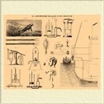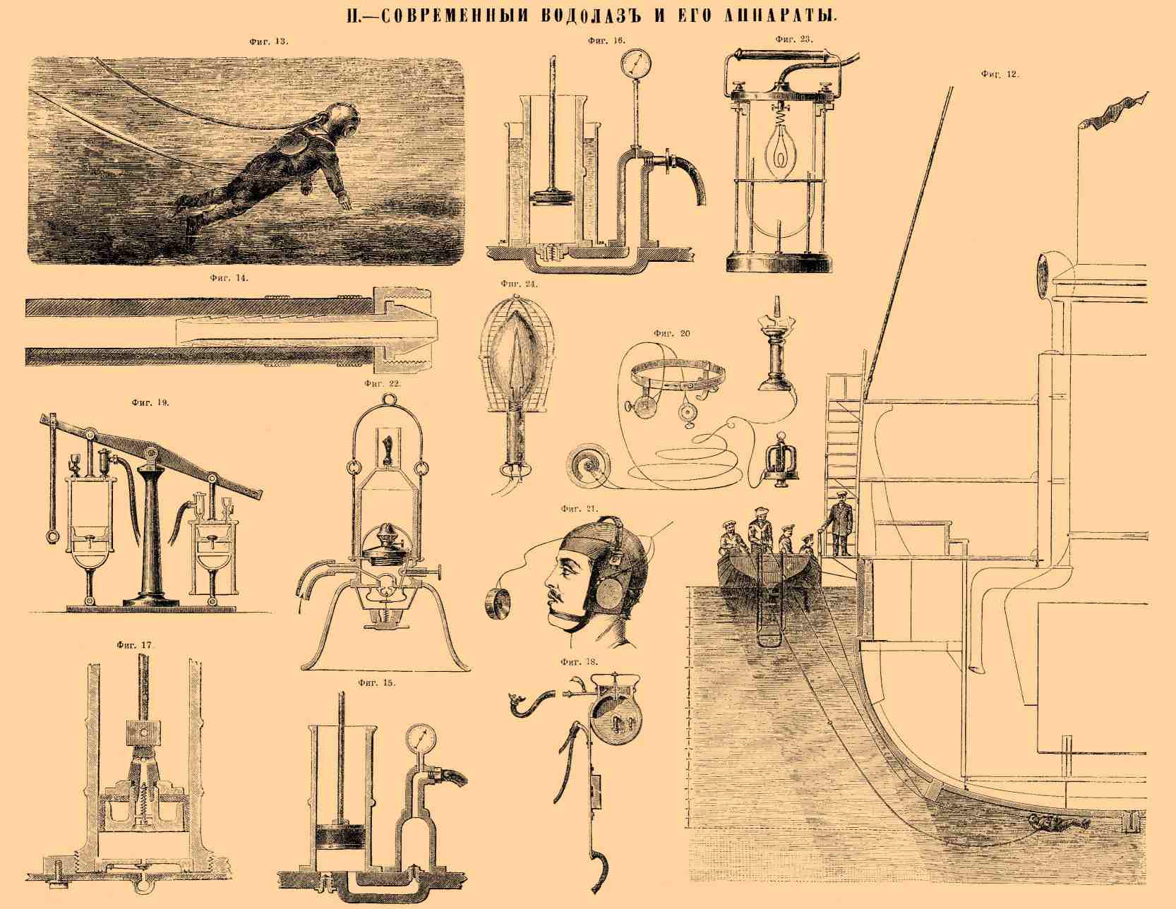 Фиг. 12 представляет половину поперечного разреза современного военного корабля, у трапа которого стоит большая шлюпка (барказ) с водолазами: один из них (старшина) держит сигнальную веревку, другой (подручный) управляется со шлангом, третий — следит за работой помпы; четвертый — фельдшер с медикаментами, остальные, уже не специалисты, качают на помпе, держатся у трапа, где стоит заведующий водолазами и аппаратом офицер или доктор; между главным килем (в самом низу) и боковым находится водолаз, осматривающий кингстон. Надо обратить внимание, что между килями бывает темно, особенно в солнечный день: — и тени резче, и самый переход водолаза от света к тени не дает ему возможности что-либо различать глазами, поэтому, кроме твердого знания всех отверстий своего корабля, водолаз должен уметь осветить их лампою и осмотреть внутри, за решеткою клапанов и кингстонов, будучи при этом в самом неудобном положении, как это видно на фиг. 12-й. — Дальнейшие рисунки изображают детали водолазных аппаратов, которые далее описаны подробнее. Три типа водолазных аппаратов, а именно: воздушный колокол, кессон и скафандр (одеяние водолаза) употребляются в различных случаях, смотря по обстоятельствам работ.