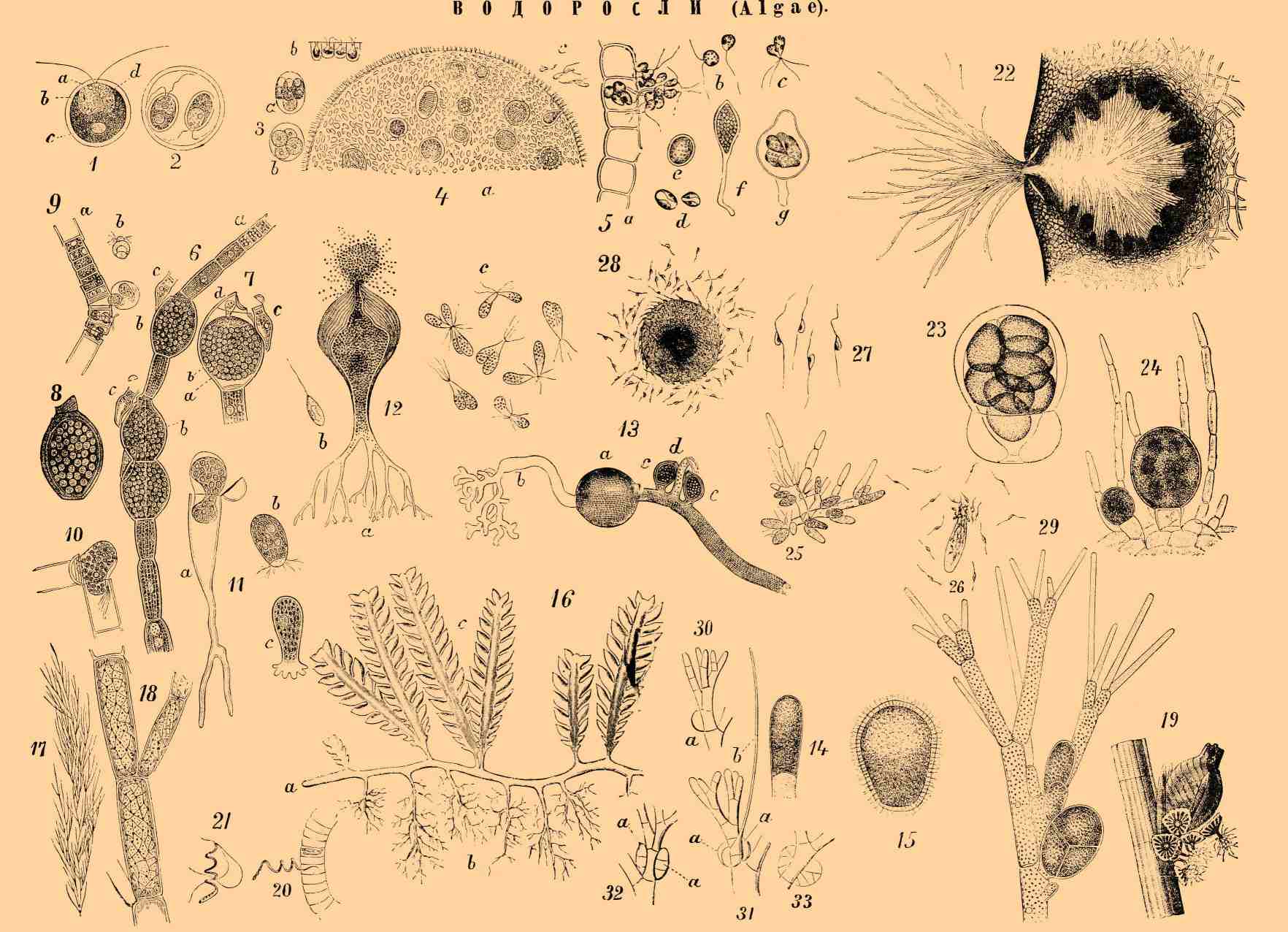 Рис. 1. Хламидомонада (Chlamydomonas pulvisculue Ehrb). Взрослая особь: а — пульсирующие вакуоли; b — красное глазное пятнышко, d — ядро, с — пиреноид. Рис. 2. Та же хламидомонада: втянув реснички, она разделилась на 2 особи — дочери (650/1, т. е. увеличено в 650 раз). Рис. 3. Та же хламидомонада. Особь — мать, втянув реснички, распалась на 4 неподвижные клетки; a — вид сбоку, b — вид сверху (480/1). Рис. 4. Вольвокс (Volvox Globator L.): а — половина половозрелой гермафродитной колонии (250/1); b — 4 нейтральных клетки в оптическом радиальном разрезе (800/1); с — сперматозоиды, умерщвленные йодом (800/1). Рис. 5. Улотрикс (Ulothrix zonata Kü tz.): а — часть нити с выходящими зооспорами (гаметами); b — зооспоры; с — копуляция зооспор; d — молодые зиготы; e, f — стадии прорастания зигот; g — зигота с зооспорами (482/1). Рис. 6. Эдогоний (Oedogonium ciliatum Pringsh.). Часть половой нити: а — антеридии; bb — оплодотворенные оогонии; cc — мужские растеньица (960/1). Рис. 7. Тот же эдогоний. Оогоний в момент оплодотворения: a — оогоний; b — оосфера (яйцеклетка, яйцо); с — мужское растеньице; d — сперматозоид (350/1). Рис. 8. Тот же эдогоний. Зрелая ооспора (350/2). Рис. 9. Эдогоний (другой вид — Oedogonium Landsboroughi Wittr.): а — часть мужской нити с выходящими сперматозоидами; b — сперматозоид (350/2). Рис. 10. Эдогоний (Oedogonium sp.). Выхождение зооспоры (350/1). Рис. 11. Тот же эдогоний: b — зооспора; c — начало ее прорастания; a — все содержимое молодого проростка выходит в виде одной зооспоры (350/1). Рис. 12. Ботридий (Botrydium granulatum Grev.): a — растение с выходящими многочисленными зооспорами (20/1); b — бесполая зооспора (300/1); с — различные стадии копуляции полов. зооспор (гамет) (400/1). Рис. 13. Вошерия (Vaucheria sessilis DC.). Нить с оогониями (cc) и антеридием (d), произошедшая из успокоившейся зооспоры (а); b — корневая часть (30/1). Рис. 14. Спорангий той же вошерии (25/1). Рис. 15. Зооспора той же вошерии (95/1). Рис. 16. Каулерпа (Caulerpa crassifolia I. G. Ag.): a — точка роста главного стебля; b — корни; с — ветви с листьями (в естеств. величину). Рис. 17. Кладофора (Cladophora gracilis Kütz.). Часть водоросли в естеств. величину. Рис. 18. Клетки той же кладофоры при увелич. около 200 раз. Рис. 19. Хара, или лучица (Chara fragilis Desv.). Архегоний и части распавшегося антеридия (слаб. увелич.). Рис. 20. Та же хара: нить с выходящим антерозоидом (сперматозоидом, 400/1). Рис. 21. Та же хара: антерозоид (400/1). Рис. 22. Фукус (Fucus platycarpus Thuret). Поперечный разрез через вместилище (conceptaculum) половых органов (сильно увелич.). Рис. 28. Фукус (друг. вид — Fucus vesiculosus L.). Зрелый оогоний (160/1). Рис. 24. Два молодых оогония того же фукуса (160/2). Рис. 25. Ветвистый кустик с антеридиями на различных стадиях развития у того же фукуса (160/1). Рис. 26. Выхождение сперматозоидов из антеридия у т. ж. ф. (330/1). Рис. 27. Фукус (Fucus platycarpus Thuret). Сперматозоиды после обработки иодом (540/1). Рис. 28. Тот же фукус. Яйцо, окруженное сперматозоидами (240/1). Рис. 29. Каллитамнион (Callithamnion corymbosum Ag.) Ветвь с тетраспорангиями. Рис. 30-33. Тот же каллитамнион. Развитие карпогонных клеток (аа), до оплодотворения (Р. 30, 31) и после оплодотворения (Р. 32, 33); b — трихогина.