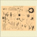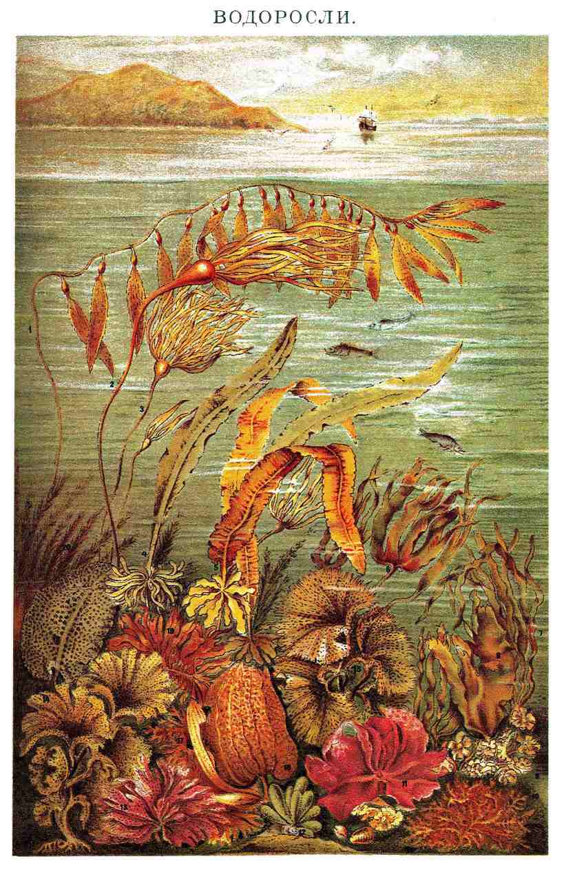 Морские водоросли у берегов Аляски. 1. Macrocystis pyrifera. — 2. Nereocystis Lütkeana. — 3. Nereocystis Lütkeana (о собь помоложе). — 4. Alaria fistulosa. — 5 Alaria esculenta. — 6. Laminaria Bongardiana. — 7. Laminaria saccharina. — 8. Laminaria digitata. — 9. Constantinea Rosa marina. — 10. Odonthalia Gmelini. — 11. Iridæ a Mertensiana. — 12. Dumontia Hydrophora. — 13. Porphyra pertusa. — 14-15. Thalassopliyllum Clathrus (crispum). — 16. Costaria Turneri. — 17. — Fucus vesiculosus. — 18. Halymenia palmata. — 19. Agarum Gmelini. — 20. Desmarestia intermedia.
