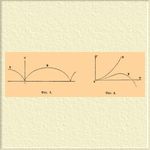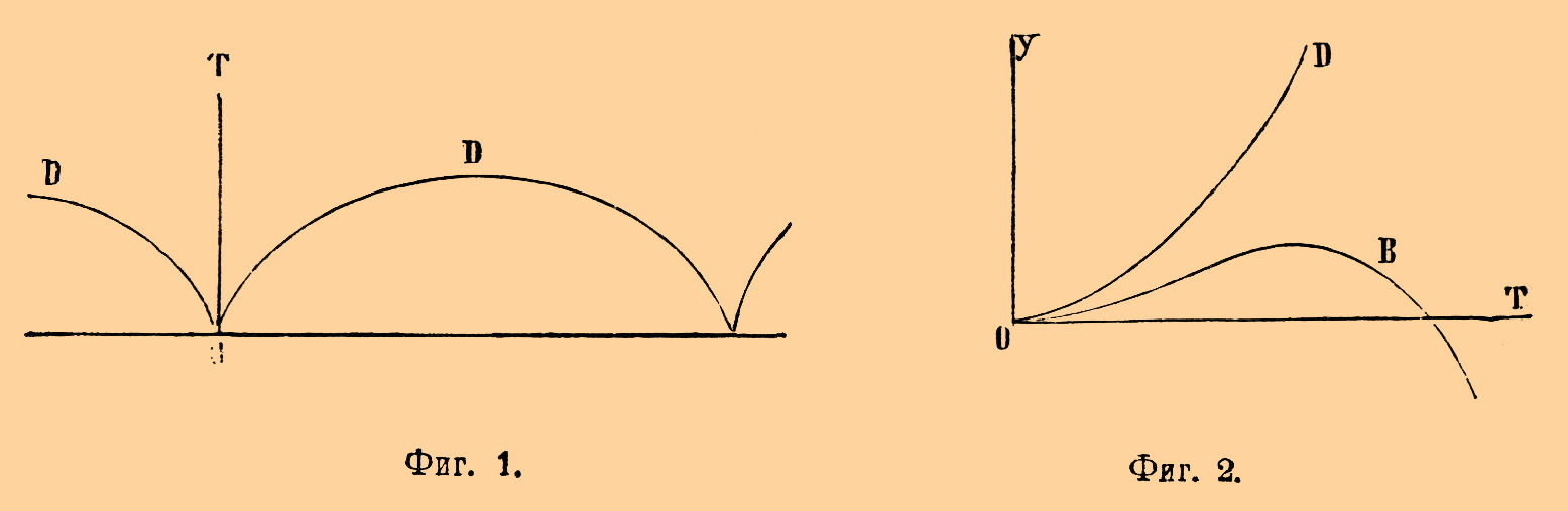т. е. точки возврата кривых и ребра возврата развертываемых на плоскость поверхностей. Точкою возврата кривой называется острие, образуемое двумя частями одной и той же кривой таким образом, что кривая, дойдя ветвью D до точки возврата О, возвращается оттуда ветвью B, имеющею в О общую касательную T с ветвью D; притом обе ветви могут быть одна по одну, другая по другую сторону касательной, как, напр., в точках возврата циклоиды (фиг. 1-я), или же могут быть обе по одну и ту же сторону общей касательной, как, например, на фиг. 2-й для кривой, выражаемой уравнением: