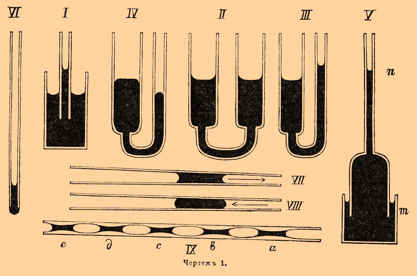 Если канал имеет неправильную форму, состоя из широких и узких частей, последовательно сменяющихся, то поднятие жидкости будет зависеть от рода расположения неправильностей канала. Но если в некоторую трубку с неправильным каналом всосать жидкость и потом оставить ее опускаться, то она остановится в той части канала, которая своим диаметром соответствует высоте, на которой жидкость остановилась, хотя бы ниже были какой угодно величины расширения канала. На черт. 1 (фиг. V) изображена трубка, соединенная с верхним концом стеклянного колокола, опущенного открытой стороной в сосуд с водой. Положим, что в этой трубке высота поднятия жидкости равна расстоянию между точками m и n. Жидкость не будет подниматься в широком стеклянном колоколе, но если ею наполнить колокол и трубку и предоставить жидкости понижаться, то она остановится на высоте точки n. Если колокол еще больше погрузить в сосуд с водой, то жидкость в трубке повысится. Если же, напротив, колокол поднимать, то жидкость на столько же станет понижаться, пока дойдет до широкого места — тогда выльется.