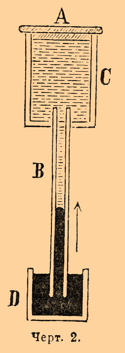 Особенности движения воды и воздуха в неправильных каналах объясняют, почему воздух труднее входит в смоченные пористые тела, чем жидкость. Чертеж 1 (IX) изображает стеклянную трубку с узкими каналами и полостями, какой пользовался Жамен для изучения основных фактов, сюда относящихся; буквами a, b, c, d, e обозначены столбики воды, собравшиеся в шейках трубочки. Предполагается, что с левой стороны (по чертежу) входит в трубку воздух, побуждаемый к тому искусственно производимым на него давлением. Капля e подается первая, но, двигаясь в более широкое место трубки, она образует с той стороны менее вогнутую поверхность, чем слева, и, следовательно, большее частичное давление, сопротивляющееся дальнейшему движению капли вправо. Когда, наконец, при достаточно сильном давлении воздуха некоторое количество его войдет в полость между e и d, капля опять собирается в e и снова закупоривает канал. Движение второй капли d начнется тогда, когда в полости (e-d) воздух будет достаточно сжат; сдвинув каплю d и разорвав ее, воздух частью перейдет в полость d-с, а капля d, собравшись опять, закроет снова вход в нее. Каждая капля представляет некоторое сопротивление движению воздуха в таком канале и сумма этих сопротивлений при большом числе капель может сделаться очень значительной. В одном из опытов (Жамена) такого рода 12 капель не пропускали воздуха, направленного в трубку под добавочным давлением в одну атмосферу. Но вода легко проходит через такую трубку, сливаясь последовательно со всеми каплями и гоня перед собой воздух к противоположному концу трубки. По этой причине воздух с трудом проникает сквозь смоченную пористую оболочку, хотя бы внутри ее и было произведено сильное разряжение, вследствие чего внешний атмосферный воздух должен бы устремиться в полость. Но вода легко проходит через подобную оболочку внутрь ее или обратно — изнутри кнаружи. Пользуясь прибором, изображенным схематически на черт. 2, можно посредством испарения воды в проницаемой смоченной оболочке заставить воду подниматься на значительную высоту.