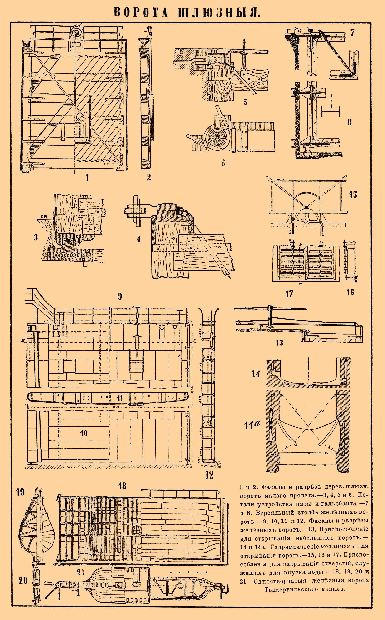 Легкость маневров движения ворот зависит прежде всего от целесообразности устройства пяты и подпятника с одной стороны, верхней цапфы и гальсбанта с другой. Все эти части должны быть расположены так, чтобы оси вращения ворот не совпадали с осью вереяльного столба. В противном случае между столбом и опорным выступом стены шлюза происходило бы трение. Эксцентриситет принимается в 1—3 сантиметра. Примеры детального устройства пяты, подпятника, верхней цапфы и гальсбанта показаны для деревянных ворот на черт. 3, 4, 5 и 6 таблицы. При железных воротах общие черты устройства этих частей те же (см. черт. 7, 8, 9 и 10 таблицы). Пята и подпятник делаются из чугуна или железа. Они должны быть возможно правильно отточены. Верхняя цапфа должна иметь общую вертикальную ось с нижней и легко вращаться в гальсбанте. Кроме того, необходимо, чтобы ворота были по возможности уравновешены. Хотя ворота и теряют значительную часть своего веса в воде, но все же остаток веса действует эксцентрично на точки вращения и затрудняет движение. Чтобы поддерживать свободный край ворот во время движения употребляют ролики, прокладывая для них особый круговой рельс на дне шлюза. Недостаток его тот, что ролик встречает обыкновенно препятствие свободному движению в виде сложившихся на дне наносов. Гораздо действеннее средство, которым пользуются при устройстве больших железных ворот. Оно заключается в том, что ворота делают плавающими, покрывая металлический скелет непроницаемой обшивкой с обеих сторон. При деревянных воротах малых пролетов отличным уравнивателем служит большое коромысло, помещаемое сверху полотна. Выступающий над стеной шлюза свободный конец коромысла поддерживает полотно и служит удобным и простым средством для открывания и закрывания ворот. При воротах больших размеров такое коромысло уже не может быть устроено. Для открывания их служат разнообразные механизмы, более или менее сложные: рейки со шпилем (черт. 13 таблицы), зубчатые арки, зубчатые полосы и т. д., наконец, гидравлические двигатели. Расположение механизмов в последнем случае показано на чертежах 14 и 14а таблицы. В непосредственной связи с легкостью маневров ворот стоит устройство отверстий для наполнения камеры шлюза водой. В шлюзах небольших пролетов они устраиваются обыкновенно в воротах (см. черт. 15, 16 и 17 таблицы). В больших шлюзах для этого служат особые акведуки в стенах шлюза (см. это слово). Что же касается остальных требований, предъявляемых к В. Ш., надо заметить, что осуществление их является одной из крайне сложных задач практической механики и строительного искусства, которая не может быть рассмотрена на страницах Словаря. Интересующиеся могут найти нужные указания по этому вопросу в литературных ссылках.
