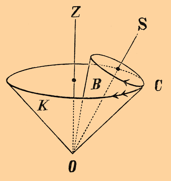 При неравномерном вращении твердого тела вокруг постоянной неподвижной оси угловая скорость выражается также формулой (1), но это уже не постоянная, а изменяющаяся с течением времени величина. Производная от нее по t или производная второго порядка от φ по t называется угловым ускорением при вращении твердого тела вокруг постоянной неподвижной оси. При равномерном или неравномерном вращении твердого тела вокруг постоянной неподвижной оси все точки тела, находящиеся на оси, остаются неподвижными; гораздо сложнее и разнообразнее вращательные движения твердого тела вокруг неподвижной точки, которая одна только остается в покое. Как бы ни было сложно такое движение, одновременные скорости всех точек тела имеют такие величины и направления, как будто бы тело вращалось вокруг некоторой оси, проходящей через неподвижную точку, так что скорости точек тела, находящихся на этой оси, равны нулю, а скорости прочих точек перпендикулярны к плоскостям, проходящим через них и через вышесказанную ось, и пропорциональны кратчайшим расстояниям от этой оси. Эта ось называется мгновенной осью вращения и величина отношений скоростей точек к кратчайшим расстояниям их от мгновенной оси — мгновенной угловой скоростью. Мгновенными называются они потому, что как направление оси, так и величина угловой скорости изменяются с течением времени. Для примера возьмем вращение конуса B вокруг его вершины O, когда этот конус катится без скольжения по другому круговому конусу K, неподвижному.