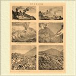 Фиг. 1. Кратер Этны в 1804—1805 гг. Фиг. 2. Кратер Этны в 1805—1809 гг. Фиг. 3. Извержение из бокового кратера Этны. Фиг. 4. Внутренность кратера Везувия в 1880 г. Фиг. 5. Шлаковидная лава Везувия. Фиг. 6. Окраина лавового потока Везувия в 1872 г. (глыбовая лава).