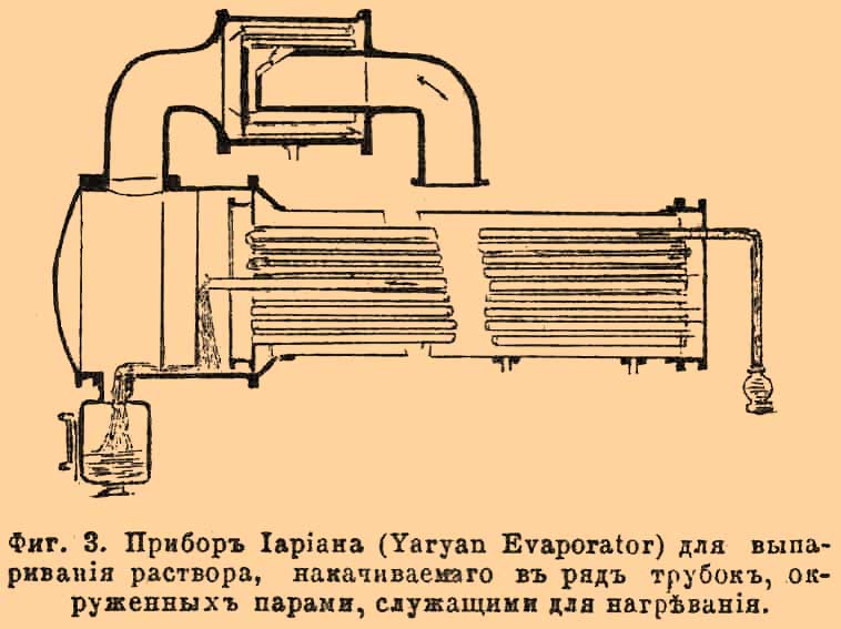 Выпариватель (Evaporator) Иapиaнa (Yaryan). H. Т. Yaryan из Огайо в С. Шт. изобрел остроумный выпариватель, который ныне очень распространен не только в Америке, но и в Европе. В нем В. происходит под уменьшенными давлениями, как в приборах тройного действия, и действиe прибора отличается от других приборов того же рода способом нагревания раствора, небольшими количествами сразу, приводя его в тесное соприкосновение с поверхностью нагрева. Вместо употребления змеевиков, погруженных в испаряемую жидкость (или нагревания поверхностью паровой оболочки), нагревание в описываемом приборе совершается посредством пара, обнимающего наружные поверхности трубок, а выпариваемая жидкость накачивается в эти трубки. Трубки расположены в лежачих цилиндрических котлах и проходят так, что накачиваемый раствор проникает через весь ряд трубок прежде, чем вытечет в сепаратор.