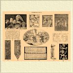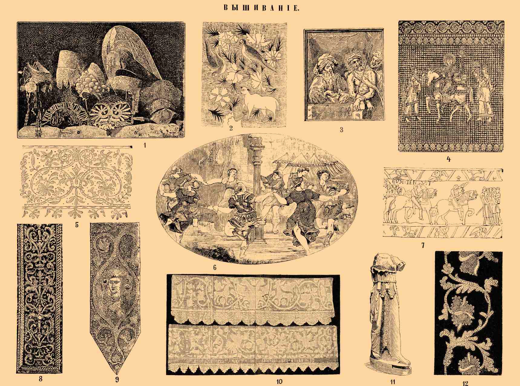 1. Женские вышитые головные уборы великорусских губерний. Из коллекции г-жи Шабельской. 2. Индейская разноцветная вышивка. Музей Клюни. 3. " Ecce Homo", вышитая картина школы Рембрандта в Лионском музее. 4. Византийская вышивка, найденная в гробнице Гунтера, епископа бамбергского. 5. Разноцветная вышивка шелками по полотну XVI века. Музей Клюни. 6. "Танец золотого тельца", вышивка медальон по рисунку Рафаэля. Музей Клюни. 7. Частные вышивки королевы Матильды, представляющей завоевание Англии Вильгельмом Завоевателем. 8. Испанская вышивка золотом и шелками по бархату. 9. Венецианская вышивка стеклярусом в Кенсингтонском музее. 10. Две старинные каймы к свадебным простыням; шиты по холсту Олонецкой губернии. 11. Обломок греческой статуи, показывающий, на что употреблялась вышивка. 12. Полоса, показывающая разные способы шитья золотом.