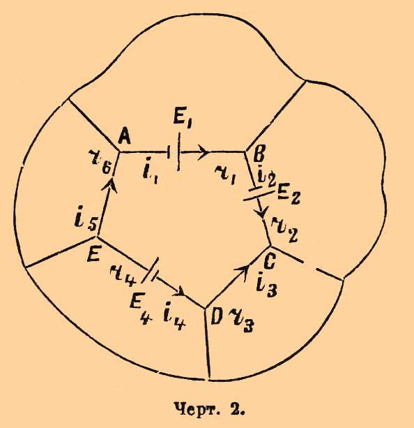 Теорема II. В каждом замкнутом контуре, выделенном из сети проводников, алгебраическая сумма произведений сил токов в различных частях этого контура на сопротивления этих частей равна алгебраической сумме электродвижущих сил источников тока, находящихся в частях рассматриваемого контура. При этом в обеих алгебраических суммах принимается для рассматриваемой силы тока и электродвижущей силы знак + или —, смотря по направлению (относительно движения часовой стрелки), какое имеет данный ток и по какому образовался бы ток от рассматриваемой электродвижущей силы.