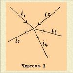 Теорема I. Если в одном месте пересекаются несколько проводников, то сумма сил токов, притекающих по проводникам к этому месту, равна сумме сил токов, утекающих от него i1 + i2 +... = i'1 + + i'2 + i'3 +... Эта теорема, иначе, выражает невозможность непрерывного накопления электричества в месте пересечения проводников (черт. 1).