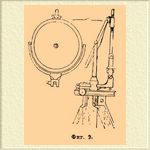 Потом на шаг впереди от 1-й треноги А ставится другая с прицелом В , гелиографист становится перед зеркалом, не заслоняя другой станции, и, смотря в зеркало, изменяет его положение до тех пор, пока отражающаяся звезда другой станции не попадет за центр зеркала, где проскоблена амальгама в кружке с горошину. Тогда, удерживая глазом занятое положение, рукой изменяют на другой треноге положение прицела до тех пор, пока отражение в зеркале черной точки на прицеле не поместится между центром зеркала и отражением звезды от другой станции; тогда эта станция, мушка прицела и центр зеркала находятся на одной линии, которая и должна сохранять свое положение (а устройство зеркала таково, что от вращения его в любую сторону центр его остается всегда на месте). Когда свет отражается от зеркала, проскобленный в центре кружок дает тень, указывающую направление света; тень эту наводят на мушку прицела и, следовательно, тем самым направляют свет на противоположную станцию. Гелиографирование производят через посредство ключа (ф. 2), которым зеркало чуть-чуть выводится из своего положения; нажав на ключ, поднимают луч света, и он становится невидим на другой станции — свет исчезает. Так принято гелиографировать за границей; в России же после установления связи между станциями придают зеркалу такое положение, чтобы теневой луч приходился ниже мушки и попадал на нее лишь при нажатии ключа (ф. 3).