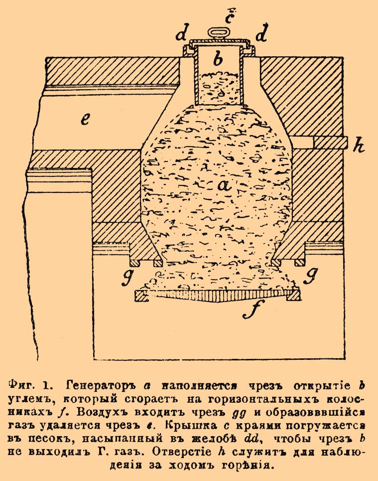 Генератор а наполняется через открытие b углем, который сгорает на горизонтальных колосниках f. Воздух входит через gg, и образовавшийся газ удаляется через e. Крышка с краями погружается в песок, насыпанный в желоб dd, чтобы через b не выходил Г. газ. Отверстие h служит для наблюдения за ходом горения.