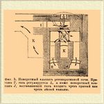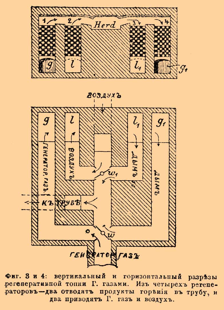 Способ пользования теплом продуктов горения для подогревания воздуха и Г. газа при регенерации, изобретенный Сименсом, состоит в том, что под печью (фиг. 3), обычно ниже уровня пола, устраивают четыре "регенератора", расположенных попарно, и в них из огнепостоянного кирпича выкладывают рыхлые клетки так, чтобы в промежутках оставалось пространство не меньше сечения трубы для выхода продуктов горения. В одну из пар регенераторов впускают отработавшие, но еще сильно накаленные продукты горения печи.