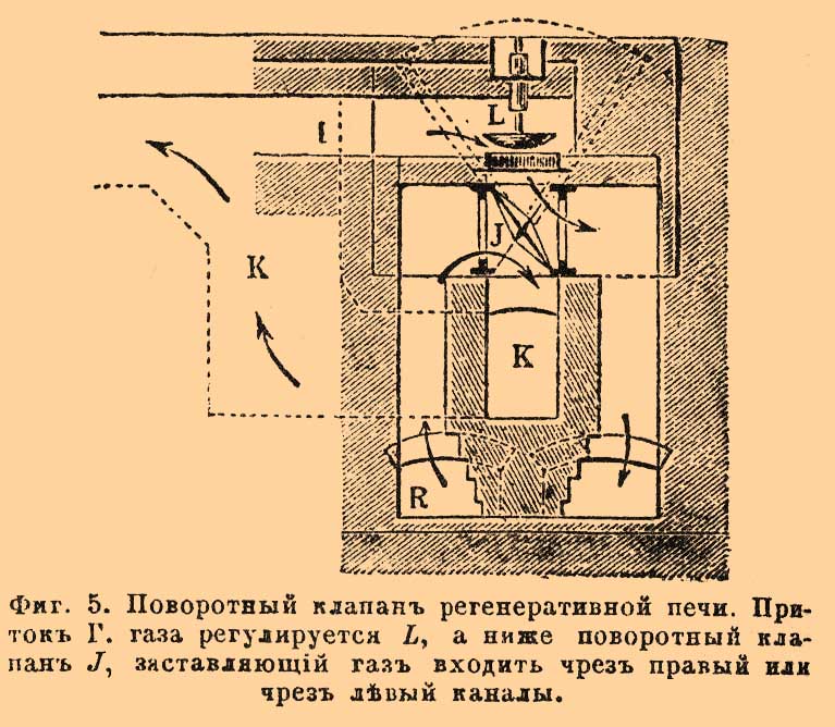 Фиг. 5. Поворотный клапан регенеративной печи. Приток Г. газа регулируется L, а ниже поворотный клапан J, заставляющий газ входить через правый или через левый каналы.