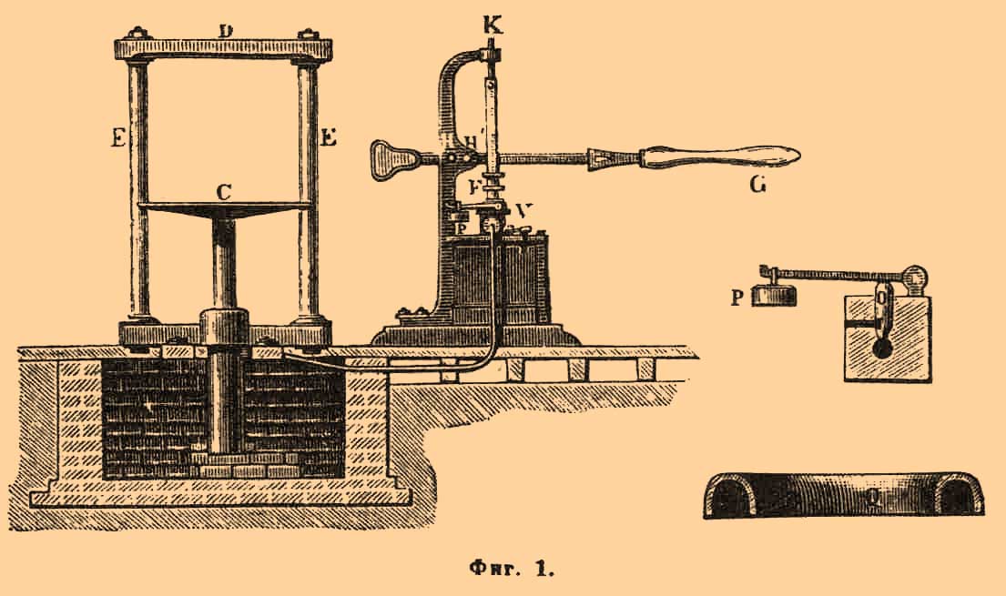 — Принцип этого могущественного орудия современной техники был открыт Паскалем. В своем посмертном трактате о равновесии жидкостей, изданном 1663 г., он пишет: "Если сосуд полный водой, закрытый со всех сторон, имеет два отверстия, одно в сто раз больше другого (относительно поверхности), с плотно вставленными поршнями, то один человек, толкающий маленький поршень, уравновесит силу ста человек, которые будут толкать в сто раз больший, и пересилит девяносто девять из них".