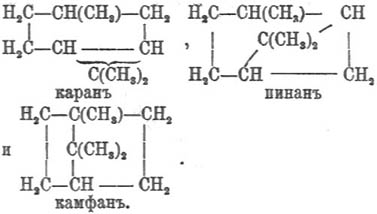 и т. д. Г. соединения широко распространены в природе, что видно из частного описания перечисленных выше Г. соединений; главную массу представляют Г. соединения ряда С n Н 2n а именно нафтены; за ними следуют терпены ряда С n Н 2n — 4. Теперь, с установлением оптической деятельности нефти и ее погонов (Био, Ракузин, Вальден), можно утверждать, что все природные Г. соединения растительного происхождения. По химическому характеру Г. соединения можно разделить на предельные и непредельные. К первым относятся гексагидросоединения, т. е. соединения ряда С n Н 2n; таковы, напр., нафтены и их производные, все они почти не способны к реакциям прямого соединения (см. частные описания), приближаясь в этом отношении к парафинам (см. соотв. статью); Г. соединения же рядов С n Н 2n — 2 и С n Н 2n — 4 и их производные напоминают по своим свойствам типичные углеводороды этиленного ряда (см. Олефины); так, они легко соединяются с галоидоводородными кислотами, свободными галоидами, также легко изомеризуются, претерпевая, напр., пинаколинную перегруппировку (см.), и т. д. Замечательно, что при дальнейшей потере водорода, переходя к ароматическим углеводородам С n Н 2n — 6 (и их производным), мы снова встречаемся с телами, как бы более насыщенными, предельными (ср. Предельные соединения); обстоятельство это заставило Байера высказать совершенно особый взгляд на строение бензола (см. Углеводороды ароматические), сводящийся ближе всего к допущению в нем кольца из 6 атомов трехатомного углерода и принять в молекулах ди- и тетрагидропроизводных (рядов С n Н 2n — 4 и С n Н 2n — 2) две и одну двойную связь. Этот взгляд имеет в настоящее время, кажется, наибольшее число сторонников. Нельзя не заметить, однако, что с общехимической точки зрения подобное химическое отношение не только не неожиданно, но скорее a priori легко предвидимо: мы имеем тела, образованные (в случае углеводородов) двумя слагаемыми — углеродом и водородом и, несомненно, должны иметь два насыщенных (более или менее резко) ряда: ряд, насыщенный водородом, — это парафины и нафтены, ряд, относительно насыщенный углеродом, — типичные, более бедные водородом углеводороды ряда С n Н 2n — 6. Моноциклические Г. соединения ряда С n Н 2n носят, согласно постановлению женевского конгресса, названия циклопарафинов (см. Циклосоединения); из них тексагидроцимол, по предложению Е. Вагнера, получил особое название ментана; полиизоциклические соединения (ряда С n Н 2n — 2) представляют комбинации гексаметиленного кольца с три-, тетра- и пентаметиленными кольцами, и изомеры С 10 Н 18 носят названия