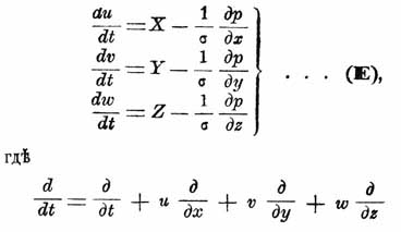 p есть давление, σ плотность, и, v, w — проекции на оси координат скорости в точке жидкости, находящейся в момент t в точке пространства, определяемой координатами x, y, z; X, Y, Z суть проекции (на оси координат) рассчитанной на единицу массы внешней силы в той же точке жидкости. К этим уравнениям. заключающим пять искомых функций (u, v, w, р, σ) от t и координат x, у, z, должно присоединить еще так называемое "уравнение неразрывности":