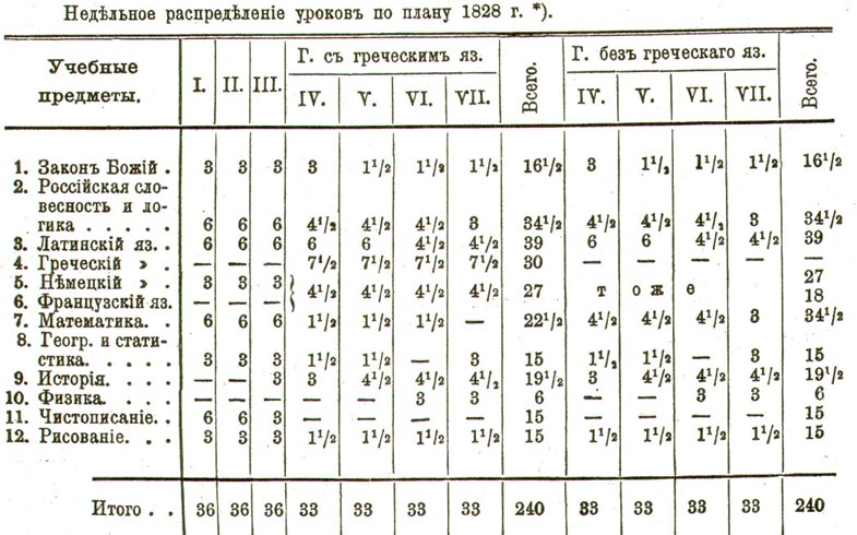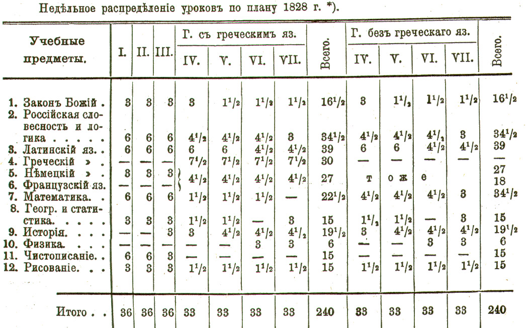 I период (1803—28). 24 января 1803 г. Александр I утвердил "предварительные правила народного просвещения", по которым Г. или губернские училища, образованные из главных народных училищ (см.), открывались в каждом губернском городе и вверялись управлению губернского директора училищ. 5 ноября 1804 г. вышел "Устав учебных заведений", подведомых университету и попечителям округов. Он объявил Г. всесословными учебными заведениями, подразделенными на 4 годичных курса. Цель их учреждения в "Уставе" определялась так: 1) приготовить к слушанию университетских наук; 2) преподать сведения, необходимые для благовоспитанного человека и 3) приготовить желающих к учительскому званию в уездных, приходских и других низших училищ. Согласно этой цели и план ученья в Г. заключал в себе начальные основания всех наук. План этот, составленный Фусом по образцу франц. лицеев, был следующий. — А. Математика — один старший учитель, 18 ур. (I кл. — алгебра, геометрия и плоская тригонометрия; II кл. — окончание чистой математики и начало прикладной, и III кл. — прикладная матем. и опытная физика). Б. История, география и статистика — один старший учитель, 18 ур. (I кл. — древняя история и география, мифология и древности; II кл. — история и география новые и в частности история и география отечественные; III кл. — общая статистика и IV кл. — статистика Российской империи). В. Философия, изящные науки и политическая экономия — один старший учитель, 20 ур. (I кл. — логика и всеобщая грамматика, II кл. — психология и нравоучение; III кл. — эстетика и риторика, и IV кл. — право естественное, право народное и политическая экономия). Г. Естественная история, технология и коммерческие науки — один старший учитель, 16 ур. (III кл. — естественная история, приноровленная к сельскому и лесному хозяйству, и IV кл. — естественная история в более широких размерах, технология и наука о торговле). Д. Латинский язык — 16 ур. (I кл. — грамматика, II кл. — чтение более легких прозаических писателей и III кл. — поэтов; во II кл. 1 час посвящался на переводы с русского яз. на латинский, а в III кл. — на обучение "в составлении лат. стихов"). Е. Языки: немецкий и французский — по 16 ур. во всех 4-х кл. (I кл. — грамматика, II кл. — переводы с языков, III кл. — объяснение прозаических писателей и переводы на отечественный яз. и IV кл. — чтение поэтов и стихотворство). Ж. Рисование — 4 ур. Обязательных уроков в каждом классе было 32. Г. могли также, если позволяли средства, "иметь учителей танцования, музыки и гимнастики", и "с позволения высшего начальства умножить число учебных предметов и учителей".