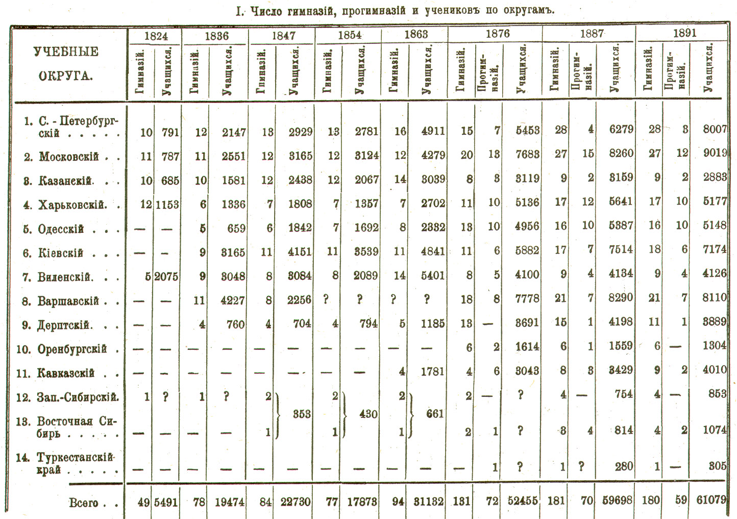 По последнему отчету министра народного просвещения, сообщающему данные за 1887 г., женских гимназий правительственных — 106, прогимназий правительственных — 180, гимназических отделений при церквях иностранных исповеданий — 8, частных Г. — 17 и прогимназий — 4. Всего Г. — 136 (более на 44, чем в 1881 г., и на 56, чем в 1877 г.) и прогимназий — 184 (более на 6, чем в 1881 г.). В них классов 2277: нормальных — 1689, параллельных — 194, приготовительных — 293 и педагогических — 9 1. Учащих всего — 6027, учащихся — 61303. Самый многолюдный — Московский округ: 10466 уч., в 19 гимназиях и 37 прогимназиях; затем Харьковский — 10337, в 18 Г. и 40 прогимназиях; Одесский — 6451, в 17 Г. и 18 прогимназиях; СПб. — 5962, в 20 гимназиях и 19 прогимназиях. Меньше всего учащихся в Туркестанском крае, где одна Г. с 267 учен. По сословиям: городское — 26462, дворянское — 24831, сельское — 4889, духовное — 4044, иностранок — 1078. По списку учебных заведений мин. народн. просв. 1892 г., к 1 января 1 890 г. число Г. и прогимназий по округам было следующее: