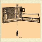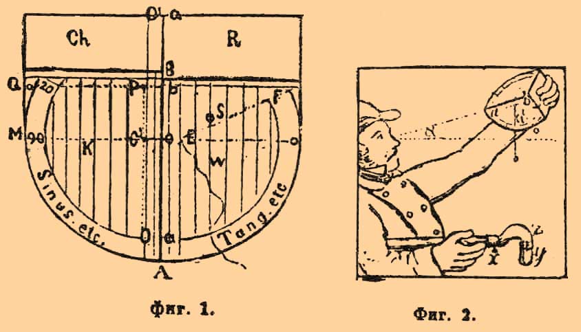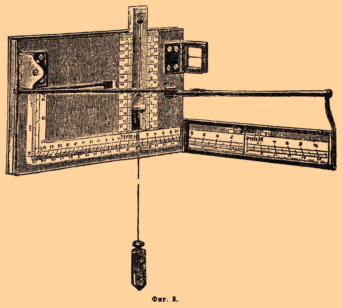 2) Зеркальный Г. Фаустманна — типичный представитель высотомеров с перемещающейся точкой укрепления нити отвеса, сообразно с изменением расстояния инструмента от измеряемого дерева. Характеристическая особенность — возможность видеть точку пересечения скалы высот (на нижнем крае) нитью отвеса (при положении деревянной доски инструмента в вертикальной плоскости) посредством отражения ее в продолговатом зеркале, укрепленном на шарнире возле предметного диоптра, а следовательно вернее прочесть показание скалы. В расстоянии 2/3 всей длины доски от глазного диоптра сделан в ней паз, в котором двигается металлическая пластинка с прикрепленной в верхней ее части нитью отвеса, а по бокам помещены скалы расстояний от дерева — одна от 10 до 60, а другая от 60 до 120 фт. Вдвигая, или выдвигая пластинку в пазе и помещая обозначенные на ней черты для совпадения с соответственными показаниями на скалах расстояния, визируют через глазной и предметный диоптры на верхушку ствола дерева; цифра на скале высот, покрытая нитью отвеса, покажет верхнюю часть высоты дерева (фиг. 3).