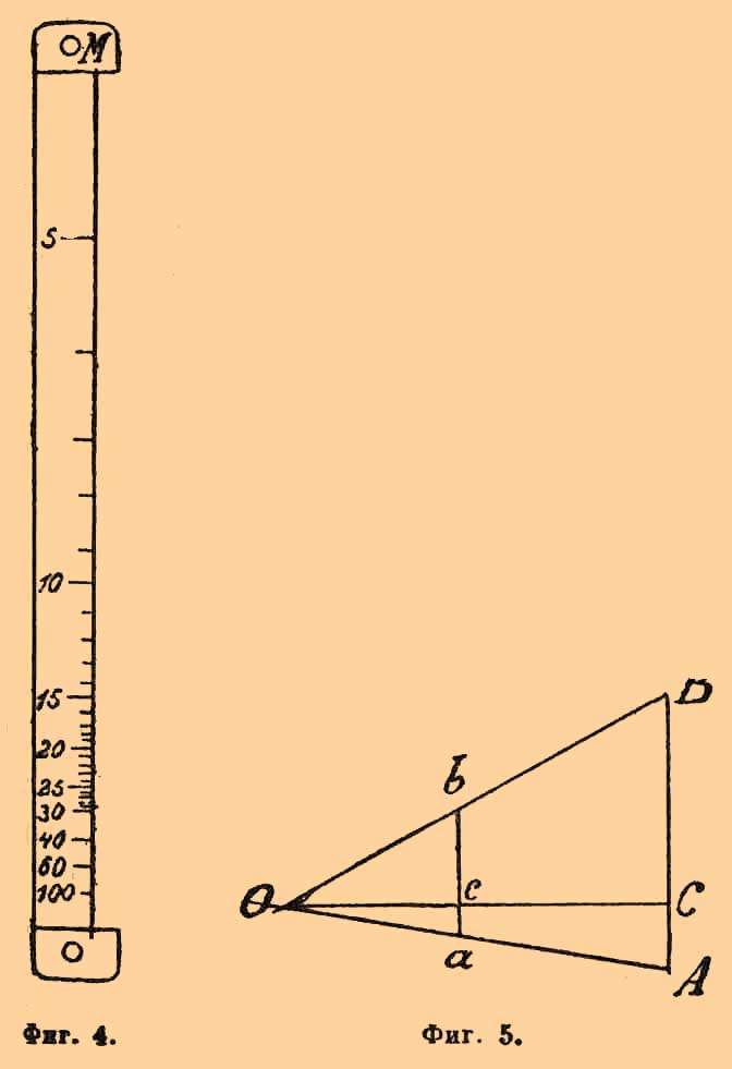 Если в О находится глаз измеряющего, AB представляет ось измеряемого ствола дерева, АС — высота кола, ab — расстояние между выступами линейки и с точка пересечения скалы линейки визирной линией ОС, направленной на вершину кола, то AB:АС = ab:ас. Но АС = 4 м и ab = 30 см, поэтому АВ = 4 м × (30 см/ac см) = 120/ac м. Чтобы высоту AB определять в частях метра, необходимо должно АВ × ас = 120, т. е. ас должно уменьшаться пропорционально увеличению AB; так, при