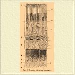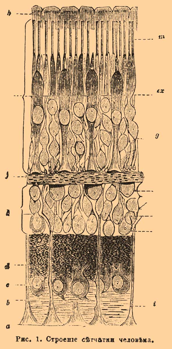 К внешней стороне сетчатки радиальные волокна поддерживающей ткани распадаются на тончайшие волоконца, также образующие перепонку, но не сплошную, а сетчатую или ситовидную, через многочисленные промежутки которой выходят нервные элементы наружного слоя ретины (membrana limitans externa, рис. 1, ex). Нервные элементы сетчатки распадаются на семь слоев. 1) Самый внутренний слой, отделенный от стекловидного тела лишь посредством membr. limit. interna, образует разветвления зрительного нерва (рис. 1, b). Проходя через склеротику, волокна зрительного нерва теряют миэлиновую оболочку и затем расходятся по радиусам по внутренней поверхности сетчатки; слой их, первоначально очень толстый, становится все тоньше к краям сетчатки. 2) Кнаружи от волокон зрительного нерва лежит слой разветвленных нервных клеток (рис. 1, с); каждая клетка дает отросток к внутренней стороне сетчатки, соединяющийся с волокном зрительного нерва, и несколько ветвей кнаружи, для соединения с дальнейшими элементами сетчатки. На всем протяжении сетчатки они расположены в один ряд, кроме области желтого пятна, где клетки лежат в несколько (8—10) рядов. 3) Внутренний сетчатый слой, слой невроспонгия (рис. 1, d) состоит из сети тончайших волоконцев, отношения которых к другим элементам сетчатки еще не выяснены с достаточной точностью; весьма вероятно, что внешние отростки клеток предыдущего слоя участвуют в образовании сети этих волоконцев. 4) Внутренний ядерный слой заключает в себе расположенные в несколько рядов клеточки, похожие на клетки 2-го слоя, овальные, или веретеновидные, с отростками на обоих концах (рис. 1, k). 5) Сетчатый наружный слой — состоит из такого же скопления тончайших волоконцев, как и сетчатый внутренний (рис. 1, f). 6). Далее кнаружи лежит наружный ядерный слой из клеточек, вытянутых на подобие волокон, но содержащих в себе крупное ядро (рис. 1, g), расположенные на разных высотах ядра лежат в несколько рядов друг над другом, образуя наиболее явственную часть этого слоя. Веретеновидные клеточки наружного ядерного слоя, с одной стороны, находятся в сообщении с лежащими кнутри от них элементами сетчатки, с другой — прилегают к membrana limitans externa; через многочисленные отверстия последней от них отходят отростки, образующие по ту сторону наружной перепонки особые образования кутикулярного характера и высокого физиологического значения. Это и будет 7-й слой сетчатки, слой колбочек и палочек (stratum bacillosum), способных воспринимать световые раздражения (рис. 1, m). Свет проникает до колбочек и палочек через все вышеперечисленные слои; колбочки (соni) и палочки (bacilli) состоят из внутреннего членика и наружного. Внутренний членик колбочки соединяется с расширенным концом клеточки предыдущего слоя; наружный членик ее имеет коническую форму. Внутренние членики палочек тоньше и несколько длиннее члеников колбочек; наружные членики их цилиндрические и значительно превосходят длиной соответственные окончания колбочек; сильно преломляют лучи света и не окрашиваются кармином. Распределение колбочек и палочек не на всем протяжении сетчатки одинаково; в соседстве желтого пятна каждая колбочка окружена венцом палочек; к периферии сетчатки увеличивается число палочек. Желтое пятно с его центральным вдавлением (fo v ea centralis) заключает одни колбочки, без палочек (остальные части сетчатки в желтом пятне 