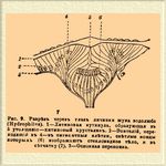 Придаточные органы глаза. Сюда относятся 1) мышцы, приводящие его в движение и 2) защитительные аппараты Г. — веки, конъюнктива и слезный аппарат. Глазная впадина или орбита (см. Череп) сама уже представляет надежную охрану органа зрения. Костяная стенка орбиты выстлана надкостной плевой, затягивающей также часть щелей между ее костями. Между глазным яблоком и стенкой орбиты лежит рыхлая соединительная ткань и жир, в которые погружены нервы и сосуды, а также мышцы Г. (табл., 3). Последние разделяются на две группы: прямые и косые мышцы (табл., 3 и 4). 4 прямых мышцы (musculi rect i) начинаются со дна глазной впадины, в окружности места вхождения в нее зрительного нерва, и направляются вперед, удаляясь друг от друга и окружая глазное яблоко. По их положению различают: верхнюю прямую мышцу (m. rectus superior), нижнюю (m. r. inferior), наружную (m. r. externus) и внутреннюю (m. r. internus). Их конечные сухожилья прикрепляются к склеротике переднего полушария глазного яблока, не доходя нескольких миллиметров до края роговой оболочки. Косых мышц две. Верхняя косая или блоковая мышца (m. obliquus superior s. trochlearis) начинается кнутри от места прикрепления верхней прямой мышцы и лежит кверху от внутренней прямой мышцы; ее тонкое конечное сухожилье проходит через волокнистый или частью хрящевой блок, прикреплённый к лобной кости, отсюда загибается под острым углом назад и кнаружи, и, пройдя своим расширенным концом под верхней прямой мышцей, прицепляется к заднему полушарию склеротики. Нижняя косая мышца (m. о. inferior) начинается на внутреннем конце нижнего края глазной впадины, идет кнаружи, кверху и кзади, проходит под верхней прямой мышцей и прикрепляется к склеротике заднего полушария глазного яблока. Расположение глазных мышц таково, что они попарно заставляют вращаться Г. около трех его осей. Подвижность глазного яблока обусловливается его положением в глазной впадине; от окружающей его соединительной ткани оно отделено особой перепонкой (fascia Tenoni), окружающей Г. в виде сумки; промежуток между склеротикой и Теноновой сумкой наполнен лимфатической жидкостью. — Защитительные органы Г. представляют из себя веки, опушенные ресницами, соединительная оболочка (conjunctiva) и слезные железы (таб., 5), выделение которых, слезы, через слезно-носовой канал перетекает в носовую полость; описание их см. под соответственными словами.