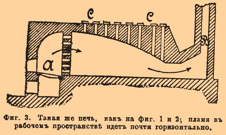 Фиг. 3. Такая же печь, как на фиг. 1 и 2; пламя в рабочем пространстве идет почти горизонтально.