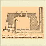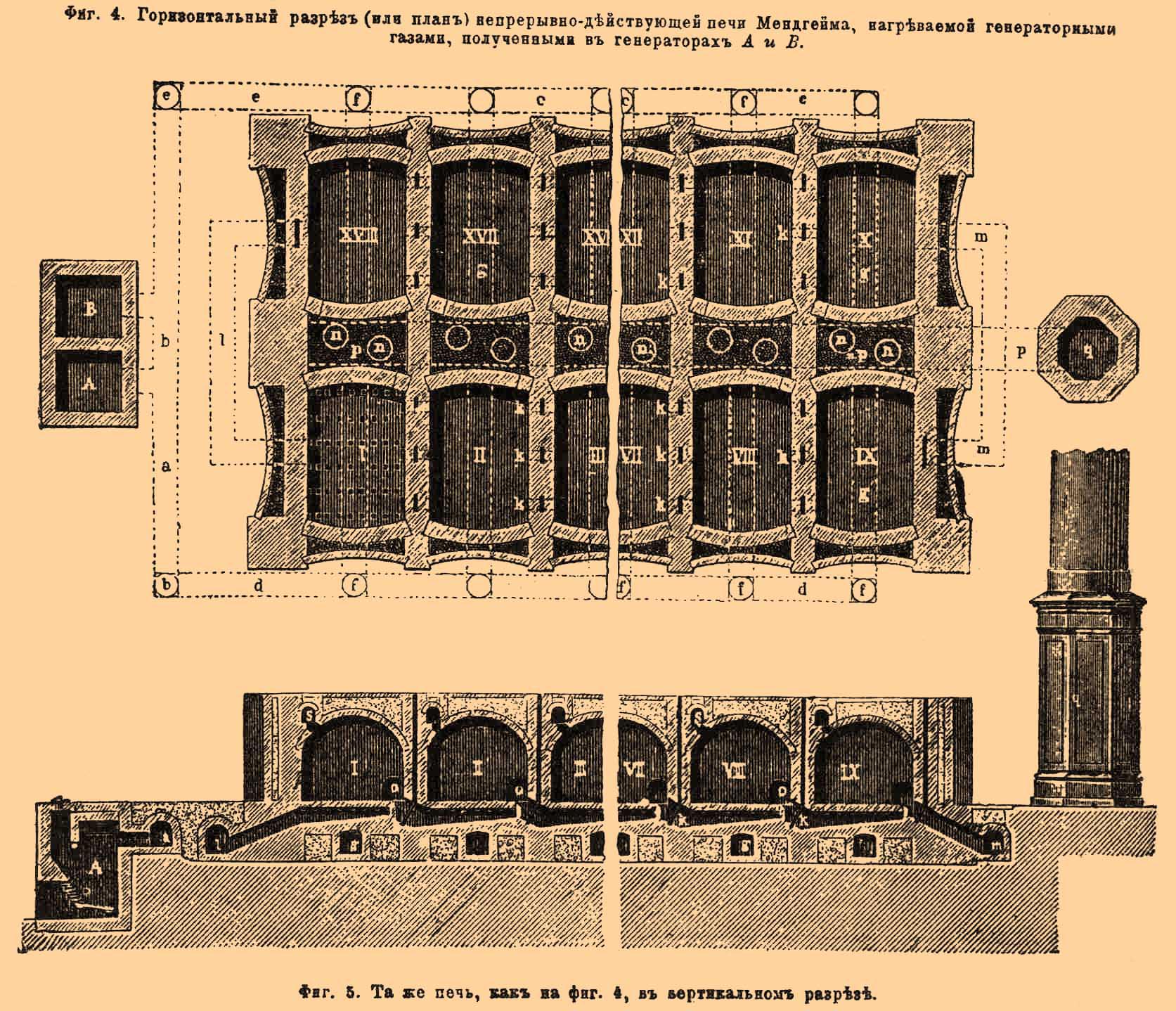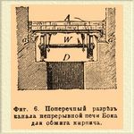 Само собой разумеется, что те отделения, в которых идет нагрузка и разгрузка, выключаются из общего круга и в них открываются, закладываемые кирпичом и замазываемые глиной, наружные отверстия; все же прочие отделения составляют соединенную систему, так что воздух, входящий в одно (наиболее уже охлажденное) отделение, служит для горения в том отделении, куда входит горючий газ, продукты же горения проходят через остальные отделения прежде, чем поступить из последнего отделения (где свежий товар только что вмещен) в дымовую трубу. Понятно, что такое устройство, отличаясь сложностью и требуя обширного пространства, покрываемого кровлей, стоит дорого (печь Мендгейма с 18 — 20 отделениями и с пространством, достаточным для ежедневного обжига 10000 огнепостоянных кирпичей или соответственного количества других гончарных изделий, стоит не менее 20000 рублей, печь Гофмана раза в 3 дешевле): но при достаточном спросе на обжигаемые изделия подобная затрата явно окупается экономией топлива, как видно из того, что во всех странах, в том числе и в России, печи этого рода ежегодно все более распространяются.