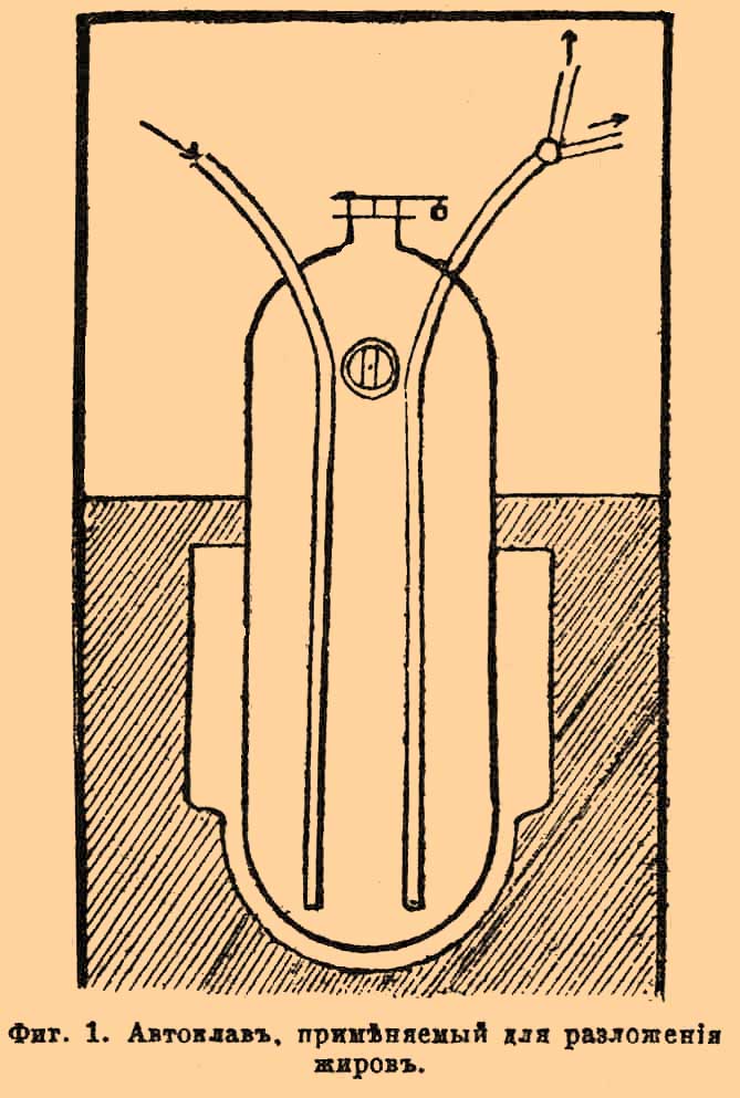 Через особую трубку, доходящую до дна автоклава, вводят в последний пар под давлением сначала в 4 атмосферы, которое затем увеличивают до 8 атмосфер и поддерживают последнее в течении 8 часов, после чего разложение жира окончено. Оно происходит в силу того, что сначала известь действует на жир, омыляя его, т. е. выделяет из него Г. и образует с жирными кислотами соль — мыло: