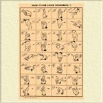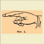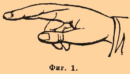 Глухонемой ребенок раньше всего инстинктивно прибегает к так наз. природным знакам. Так, напр., если он голоден, он будет подражать акту еды и поднесет пальцы ко рту. Ребенок постарше изобразит воду, представляя пальцами падающий дождь или обеими руками изобразит процесс умывания Желая дать понятие о камне, он складывает руку в кулак или прижимает кулаки друг о друга, или наклонится, будто схватывает камень с земли, и изобразит акт метания его и т. п. В учебных заведениях, в которых преподается мимическая речь, естественные знаки заменяются искусственными, так наз. ручной, или дактилологической, азбукой, которую ученик изучает одновременно с начертанием букв. Каждая буква алфавита изображается с помощью пальцев руки, при чем составляемые знаки имеют некоторое подобие букв писанных, как это видно из прилагаемой таблицы. Учащемуся предъявляется одновременно предмет или рисунок, пишется его название и изображается условно знаками дактилологической азбуки. Учась письму, ребенок учится чтению. Путем продолжительного опыта он начинает различать и усваивать себе значение отдельных букв, а затем легко изучить уже и печатный текст. Путем долговременного навыка изложение мысли дактилологическими знаками совершается с быстротой, не уступающей процессу писания, тем более, что беседующие между собой прибегают к целому ряду мимических знаков, которые сокращают самый процесс беседы. Так, например, желая указать на процесс сна, беседующий кладет голову с закрытыми глазами на ладонь руки и т. д. Говорящий о себе, всегда указывает на себя указательным пальцем, а никогда не изобразит себя условной буквой "Я", хотя и имеющейся в алфавите (фиг. 1).