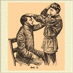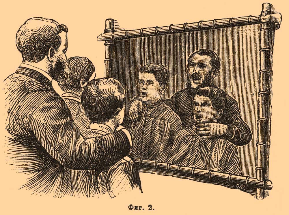 3) Самое важное, это — развитие движений различных звукопроизводящих органов: рта, языка; при чем учителем рекомендуется: 1) открывание и закрывание рта при различной ширине; 2) открывание и закрывание губ, втягивание и вытягивание их вперед и назад; 3) движения языка вперед и назад при умеренно открытом рте; 4) то же в различные стороны, вверх и вниз; 5) язык высовывается настолько изо рта, чтобы захватить собой верхнюю губу, — потом нижнюю; 6) рот открывается свободно, язык укладывается плашмя и остается в спокойном состоянии; 7) челюсти должны свободно без всякого усилия, двигаться вперед и назад. Наконец, необходимо развивать способность сосредоточить внимание путем зрения, для чего ученика заставляют при неподвижности головы: 1) поднимать и опускать глаза, 2) поворачивать их вправо и влево и 3) вращать их. Большую услугу при подобных занятиях оказывает зеркало, перед которым учитель и ученик повторяют одни и те же движения, при чем учитель иногда пальцами содействует ученику в тех или других движениях органов речи (см. фиг. 2).