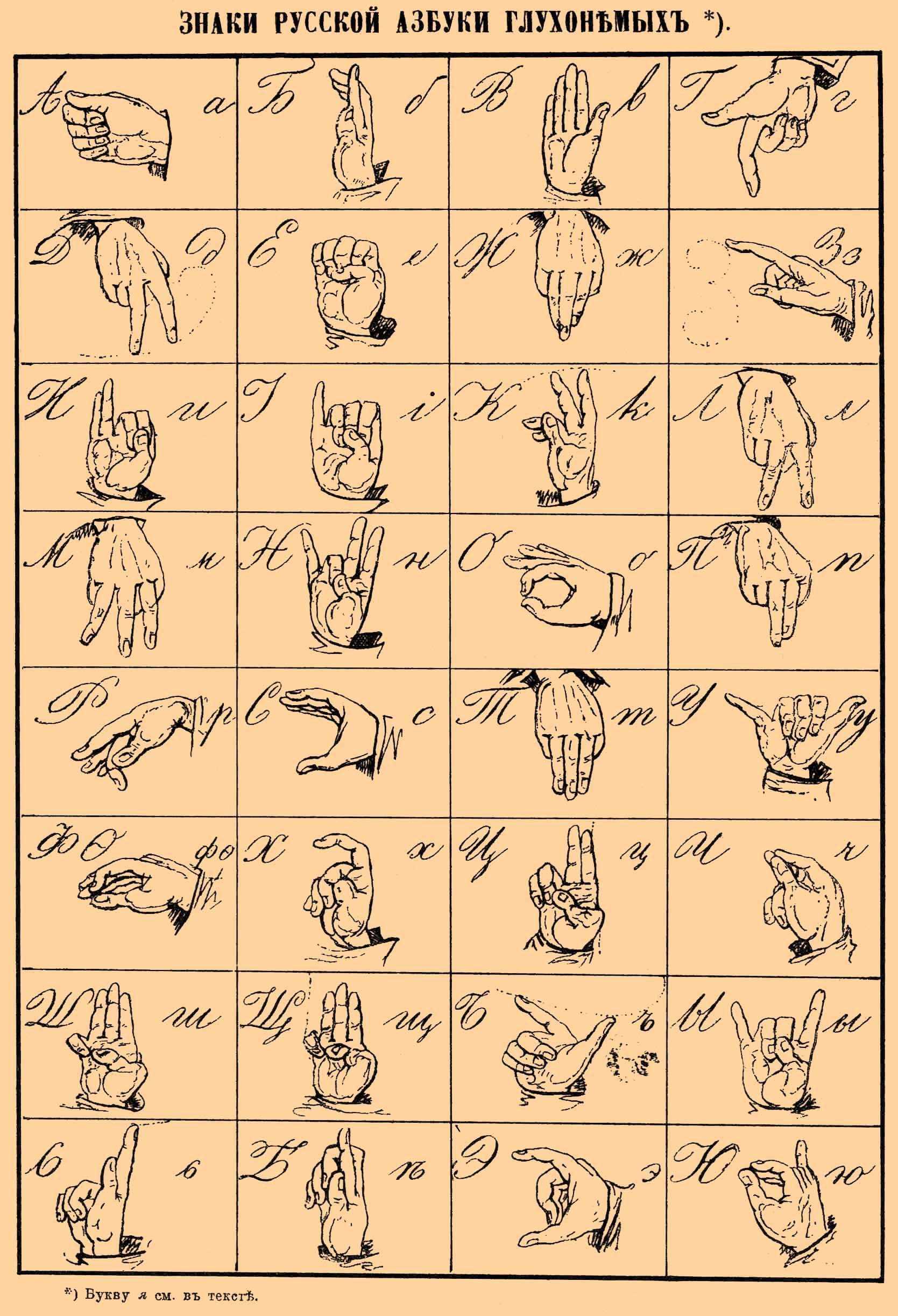 ЗНАКИ РУССКОЙ АЗБУКИ ГЛУХОНЕМЫХ [Букву я см. в тексте.].