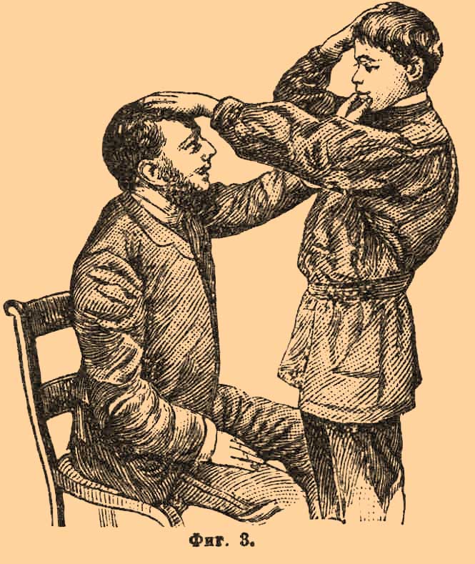 Если ученику покажется мало ощущения дуновения на руке, то надо сдуть бумажку со стола. При произношении этой буквы ученик видит свободно сложенные губы и чувствует — теплое дыхание, воздух, выходящий сквозь губы. При букве ф ученик видит не только соответственное положение органов, но и чувствует холодную струю воздуха, проходящую через маленькую щель между верхними зубами и нижней губой. Наибольшее затруднение для глухонемых представляет постановка буквы и, при которой дрожание воздуха ощущается на краях зубов, в месте соединения верхних и нижних челюстей, на макушке головы, сбоку на шее. Учитель может дать почувствовать этот звук ученику, зажав между зубами один конец тонкой палочки, другой же конец ее вложив между зубами ученика; тогда, при произнесении звука, ученик может ощутить дрожание палочка вследствие напора воздуха. Некоторые учителя при этом звуке заставляют ученика держать руку на макушке головы, — прием, осуждаемый многими авторитетами (см. фиг. 3).