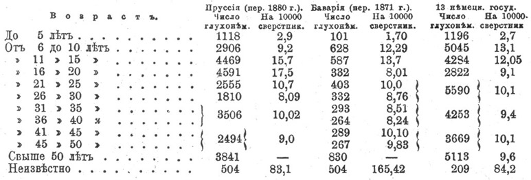 Некоторые статистики указывали также на расовое предрасположение некоторых народностей к Г.; по Либрейху, протестанты и католики дают на 10000 чел. 4,52 Г.; евреи 14,86, по Крамеру, последние дают 27,17, другие народности 6,66. В Пруссии на 10000 евреев приходится глухонемых 14,88; протестантов 965; католиков 10,27. В Баварии на 10000 евреев приходится 18,16 гл.-нем. у протест. 9,47, у католиков 8,56. Сомнительно, чтобы столь высокое разнообразие %% зависело исключительно от расовых особенностей населения; скорее, высокий % Г. у евреев зависит от частоты среди них кровных браков и невысокой детской смертности, по причине которой выживают дети с теми или другими пороками развития. Для практических целей, как об этом будет сказано ниже, чрезвычайную важность представляет возрастное распределение Г. и особенно определение числа их в школьном возрасте.