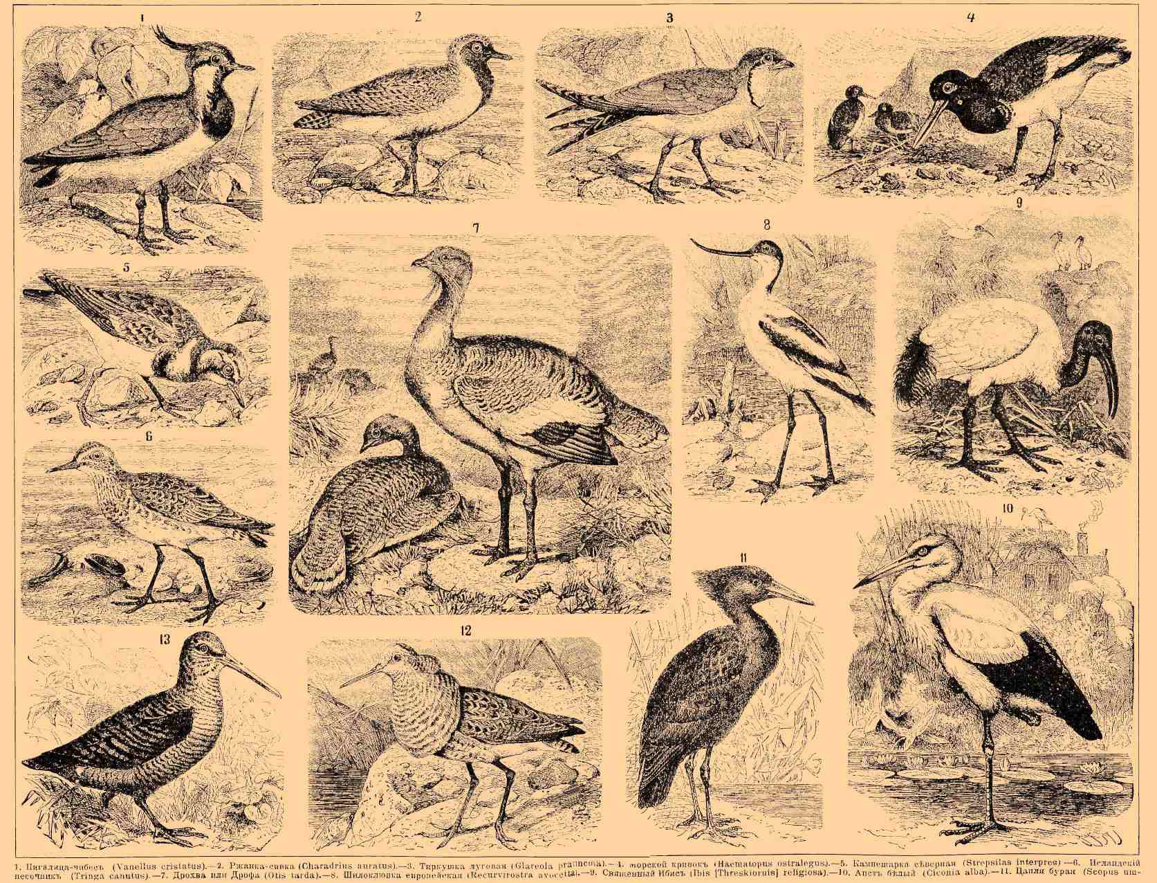 1. Пигалица-чибис (Vanellus cristatus). 2. Ржанка-сивка (Charadrius auratus). 3. Тиркушка луговая (Glareola pratincola). 4. Морской кривок (Haematopus ostralegus). 5. Камнешарка северная (Strepsils interpres). 6. Исландский песочник (Tringa canutus). 7. Дрохва или дрофа (Otis tarda). 8. Шилоклювка европейская (Recurvirostra avocetta). 9. Священный ибис (Ibis [Threskornis] religiosa). 10. Аист белый (Ciconia alba). 11. Цапля бурая (Scopus bretta). 12. Турухтан (Machetus pugnax). 13. Вальдшнеп (Scolopax rusticola).