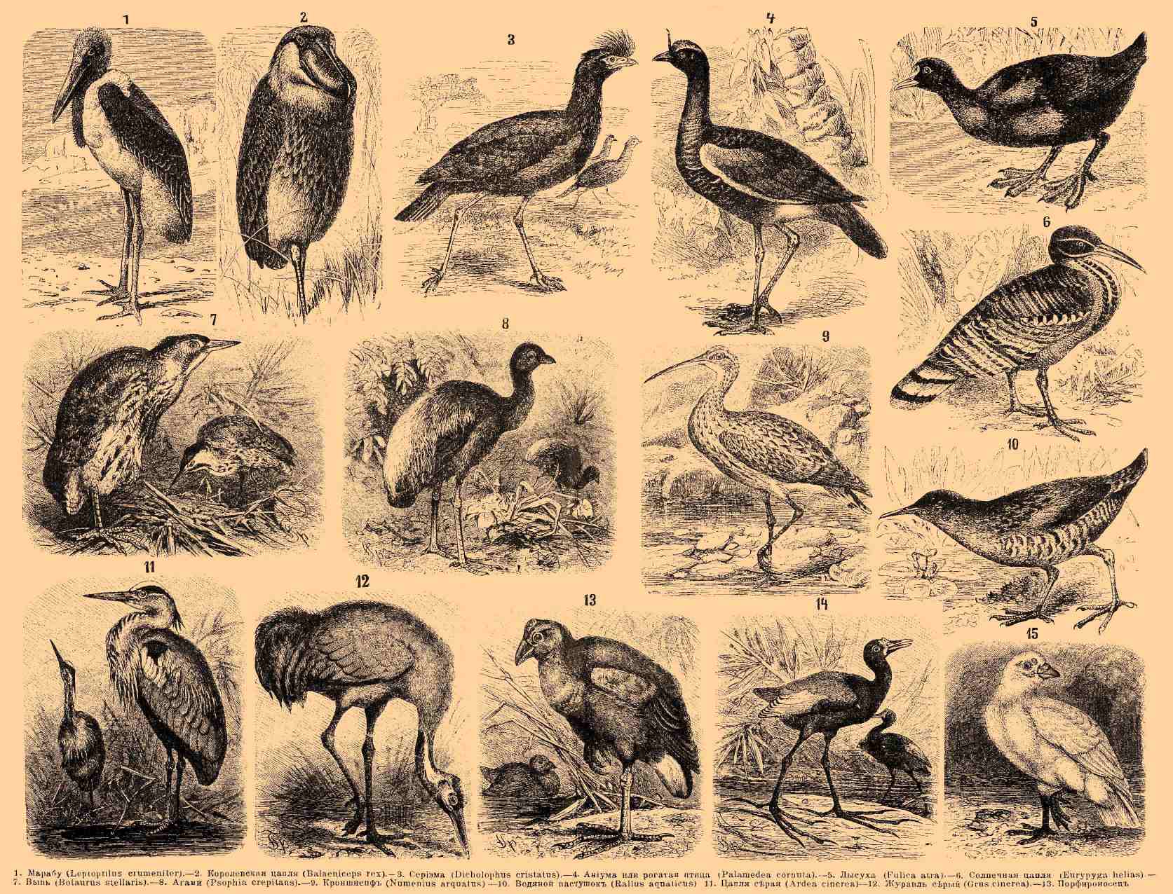 1. Марабу (Leptoptilus crumeniter). 2. Королевская цапля (Balaeniceps rex). 3. Сериэма (Dicholophus cristatus). 4. Аниума, или рогатая птица (Palamedea cornuta). 5. Лысуха (Fulica atra). 6. Солнечая цапля (Eurypyga helias). 7. Выпь (Botaurus stellaris). 8. Агами (Psophia crepitans). 9. Кроншнеп (Numenius arquatus). 10. Водяной пастушок (Rallus aquaticus). 11. Цапля серая (Ardea cinerea). 12. Журавль серый (Grus cinerea). 13. Порфироносец (Porphyrio smaragdonotus). 14. Яссана (Parra jassana). 15. Chionis minor.