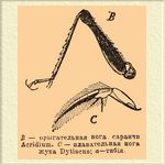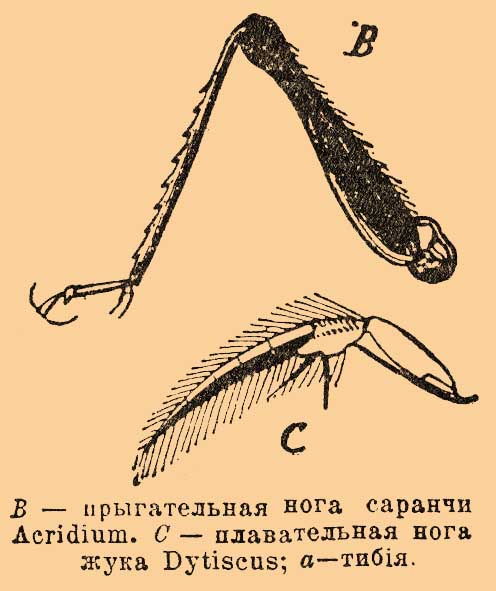 В — прыгательная нога саранчи Akridium. С — плавательная нога жука Dytiscus; а — тибия.