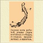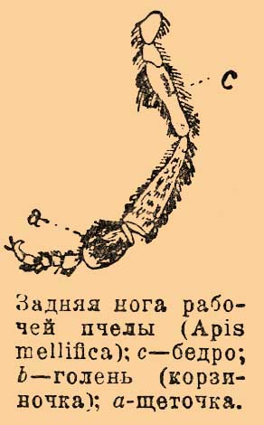 Задняя нога рабочей пчелы (Apis mellifica); с — бедро, b — голень (корзиночка); а — щеточка.