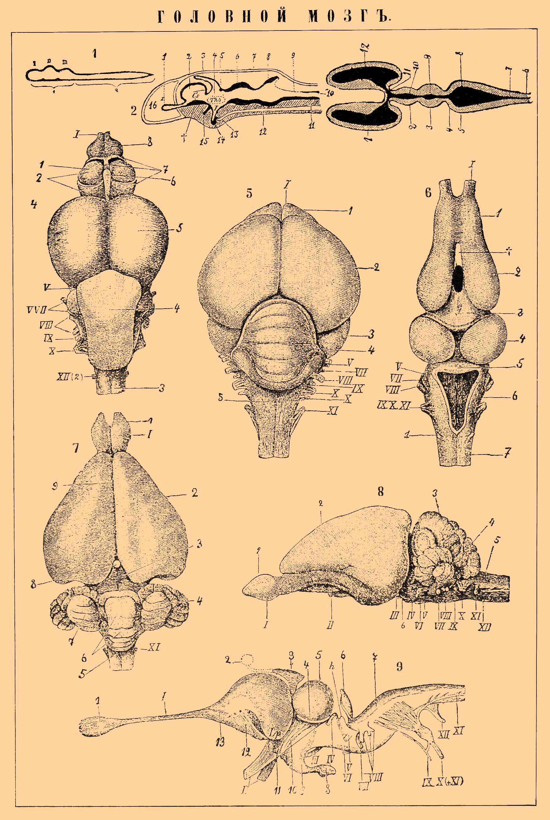 (Encephalon). Содержание: А. Анатомия головного мозга человека: 1) строение Г. мозга, 2) оболочки мозга, 3) кровообращение в Г. мозгу, 4) ткань мозга, 5) ход волокон в мозгу, 6) вес мозга. — В. Эмбриональное развитие Г. мозга у позвоночных животных. — С. Строение Г. мозга в различных классах позвоночных животных. — D. Функции Г. мозга (физиол.): 1) продолговатый мозг, 2) мозговые ножки, 3) мозжечок, 4) четырехолмия, 5) полосатые тела, 6) полушария мозга.