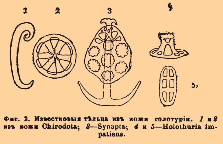 Фиг. 2. Известковые тельца из кожи голотурии. 1 и 2 из кожи Chirodota; 3 — Synapta; 4 и 5 — Holothuria impatiens.