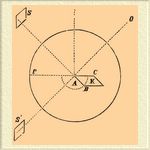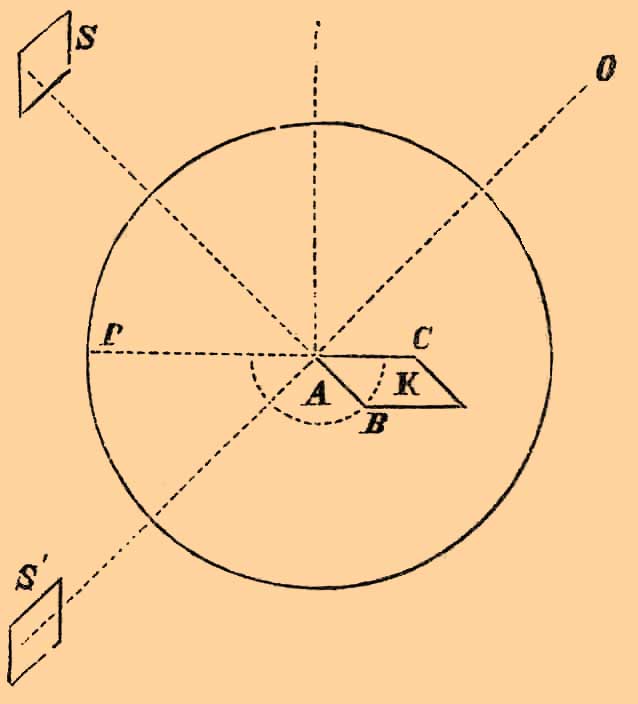 Пусть АС и AB две блестящие поверхности кристалла K, образующего двугранный угол CAB; S — некоторый ясно видимый предмет, напр. небольшой бумажный прямоугольник, наклеенный на оконном стекле; S' — другой такой же прямоугольник, помещенный внизу, — предметы эти называются сигналами; О — глаз наблюдателя.