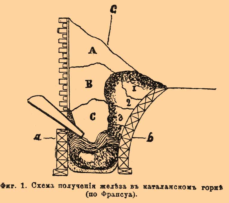 Фиг. 1. Схема получения железа в каталонском горне (по Франсуа).
