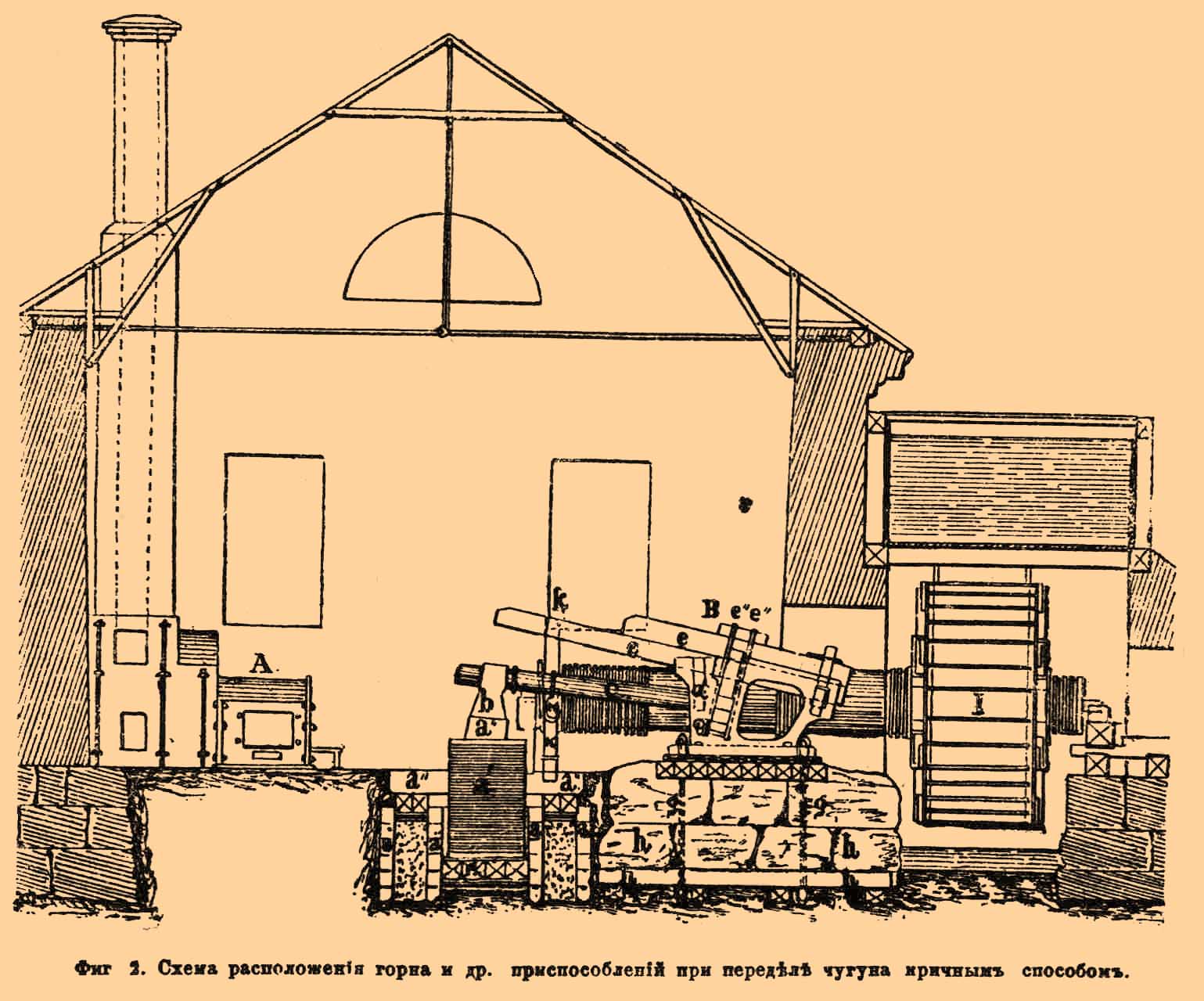 Фиг 2. Схема расположения горна и др. приспособлений при переделе чугуна кричным способом.