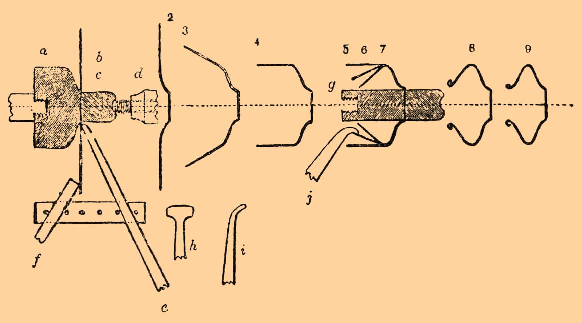 Округлый конец закаленого стального давильника прикасался бы к плоскому металлу в одной точке, если бы оба эти предмета были абсолютно неизменяемы; но уже при небольшом нажиме давление на единицу поверхности становится так велико, что мягкий металл поддается, растягивается и образует впадину. Впадина эта под влиянием вращения и надлежащего перемещения давильника переходит по спиральной линии от центра к окружности. Таким образом последовательно получаются профили 2, 3, 4, пока кружок не будет вполне "наведен" на патрон. Тогда его переменяют на другой (g на рис.), давлением снаружи последовательно получают профили: 5, 6, 7; потом крючковатым давильником i завертывают край и наконец наводят отверстие плотно на цилиндрическую часть патрона g, чтобы обеспечить правильность формы. Легче всего поддаются такой обработке мягкие сплавы олова: так делают, например, оловянные бутылочные капсюли. Цинк давится тоже легко, но его надо нагревать до шипения от прикосновения мокрым пальцем (около 150° Ц.) и работать быстро, пока металл не остыл. Красная медь, серебро и латунь не допускают "высокой" наводки без промежуточных отжигов (см.): после двух-трех проходов давильником они становятся столь упругими, что более не тянутся и начинают давать складки и трещины. Железо давится очень трудно, хотя в Англии изготовляют особый сорт очень мягкой жести, выдерживающей довольно продолжительную обработку с помощью давильников из латуни. Только тонкие листы, от 0,2 до 1 мм, обрабатываются удобно; листы от 1 до 8 мм требуют уже больше затраты механической работы, станка с сюпортом и стального колесика в виде накатки вместо простого давильника. Искусство давления металлов было изобретено, вероятно, в конце XVIII ст. в Англии, где в это время стало развиваться производство посуды из так называемого британского металла, очень удобно обрабатываемого по этому способу. В 1816 г. этот прием работы стали применять в Париже на фабриках так называемого накладного серебра; хотя его держали в секрете, но уже в 1820 г. он стал применяться в Вене и скоро стал общеизвестным. Ср. Teyschl. and H. Zoff, "Das Metalldrucken" (рус. перев. изд. "Ремесленной газеты", М., 1813).