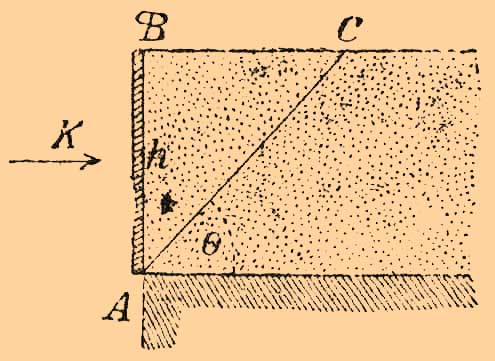 в которой γ — вес куб. м грунта, h — высота подпорной стены и φ — угол естественного откоса. Для песка, напр., которого угол естественного откоса = 30° и вес куб. м 1800 км, К = 300 кг при h = 1 м. Если частицы грунта, кроме того, обладают еще некоторым сцеплением, то давление на погонный м подпорной стены вычисляется по формуле: