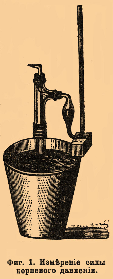 — вызывает плач растений (см. Физиолог. растений). Если весной до распускания почек срезать ветвь, то из пораненного места потечет прозрачная жидкость. Для измерения силы, с какой выгоняется сок, к срезанному концу стебля прикрепляется ртутный манометр (фиг. 1).