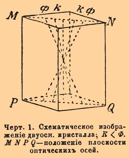 Черт. 1. Схематическое изображение двуосн. кристалла; K<Ф. MNPQ — положение плоскости оптических осей.