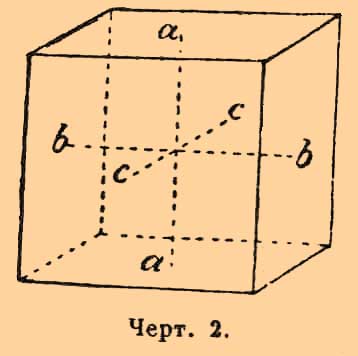 Искусственное подражание одноосному кристаллу можно получить, напр., сжимая стеклянный куб по нормальному направлению к какой-нибудь его грани; по этому направлению частицы будут сближены, и упругость светового эфира от действия на него частиц тела изменится; по всем же направлениям, перпендикулярным к первому, расположение частиц, а также и упругость эфира будут одинаковы, но отличны от первого. Если стеклянный куб, сжатый уже, положим, по вертикальному направлению, сжать, кроме того, но с меньшей или большей силой, по горизонтальному направлению между двумя взаимно противоположными гранями, то в этом кубе по трем взаимно перпендикулярным, направлениям (аа, bb, cc — черт. 2) плотность и упругость тела будут различны, а также упругость эфира будет наибольшей по одному из этих, наименьшей по другому и промежуточной по третьему.